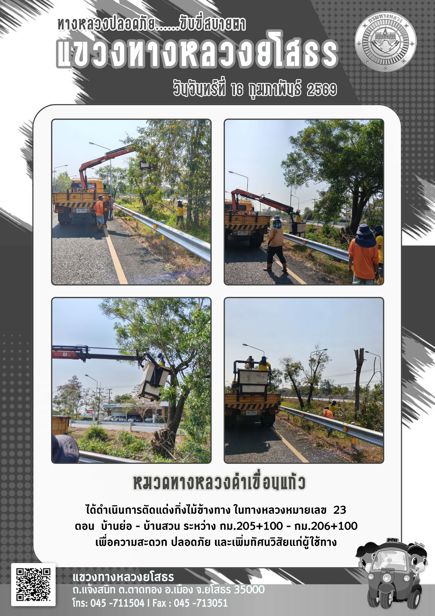 วันจันทร์ที่ 16 กุมภาพันธ์ 2569 หมวดทางหลวงคำเขื่อนแก้ว ได้ดำเนินการตัดแต่งกิ่งไม้ข้างทาง ในทางหลวงหมายเลข 23 ตอน บ้านย่อ - บ้านสวน ระหว่าง กม.205+100 - กม.206+100 เพื่อความสะดวก ปลอดภัย และเพิ่มทัศนวิสัยแก่ผู้ใช้ทาง