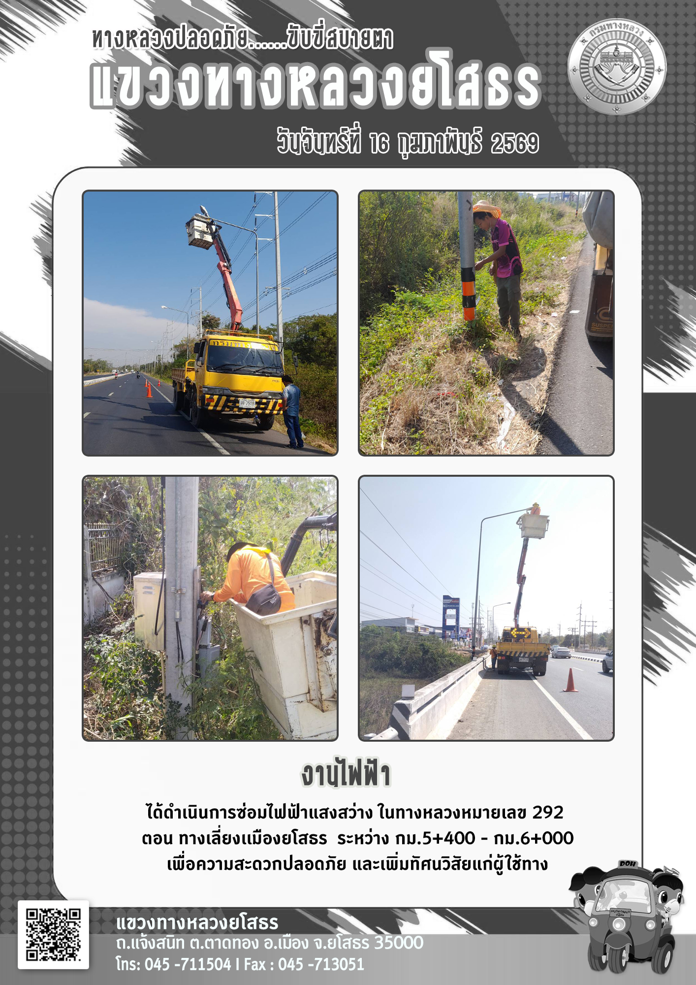 วันจันทร์ที่ 16 กุมภาพันธ์ 2569 งานไฟฟ้า ได้ดำเนินการซ่อมไฟฟ้าแสงสว่าง ในทางหลวงหมายเลข 292 ตอน ทางเลี่ยงแมืองยโสธรร ระหว่าง กม.5+400 - กม.6+000 เพื่อความสะดวกปลอดภัย และเพิ่มทัศนวิสัยแก่ผู้ใช้ทาง