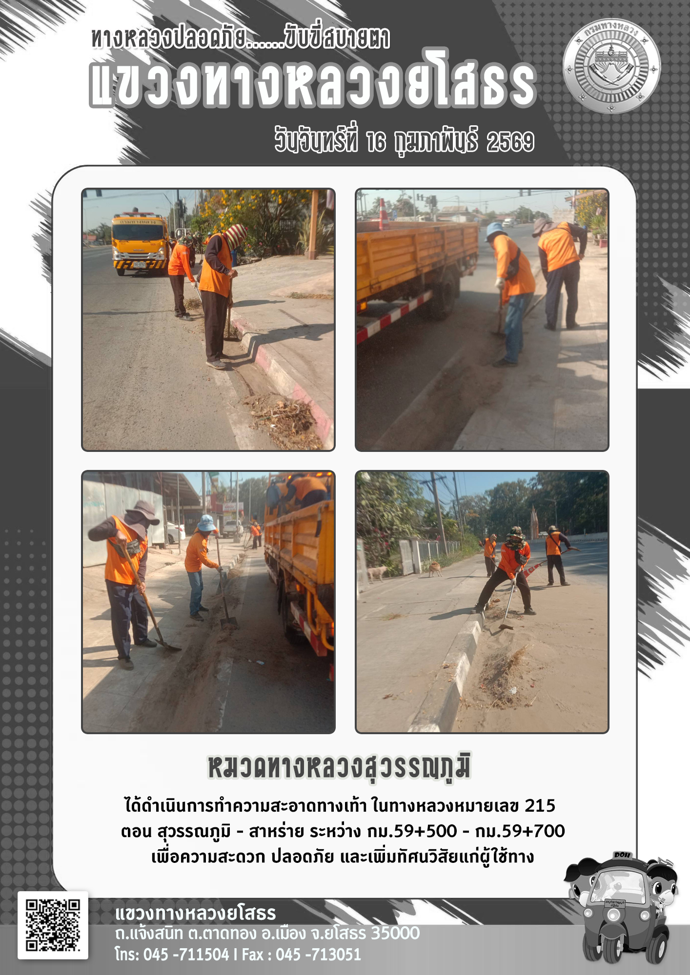 วันจันทร์ที่ 16 กุมภาพันธ์ 2569 หมวดทางหลวงสุวรรณภูมิ ได้ดำเนินการทำความสะอาดทางเท้า ในทางหลวงหมายเลข 215 ตอน สุวรรณภูมิ - สาหร่าย ระหว่าง กม.59+500 - กม.59+700 เพื่อความสะดวก ปลอดภัย และเพิ่มทัศนวิสัยแก่ผู้ใช้ทาง