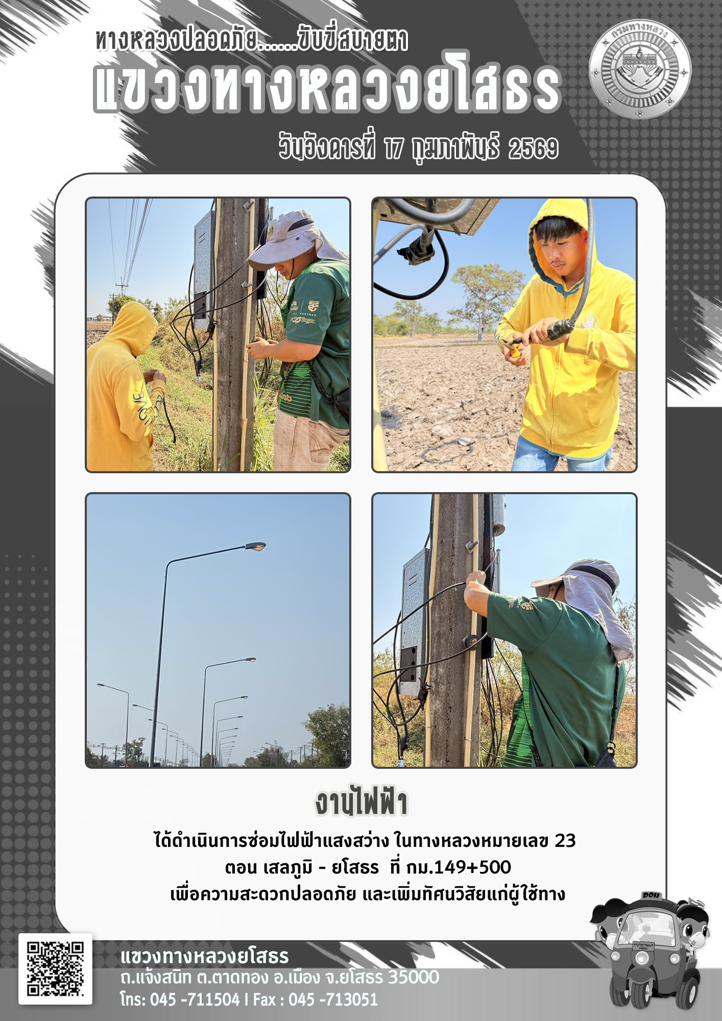 วันอังคารที่ 17 กุมภาพันธ์ 2569 งานไฟฟ้า ได้ดำเนินการซ่อมไฟฟ้าแสงสว่าง ในทางหลวงหมายเลข 23 ตอน เสลภูมิ - ยโสธร ที่ กม.149+500 เพื่อความสะดวกปลอดภัย และเพิ่มทัศนวิสัยแก่ผู้ใช้ทาง
