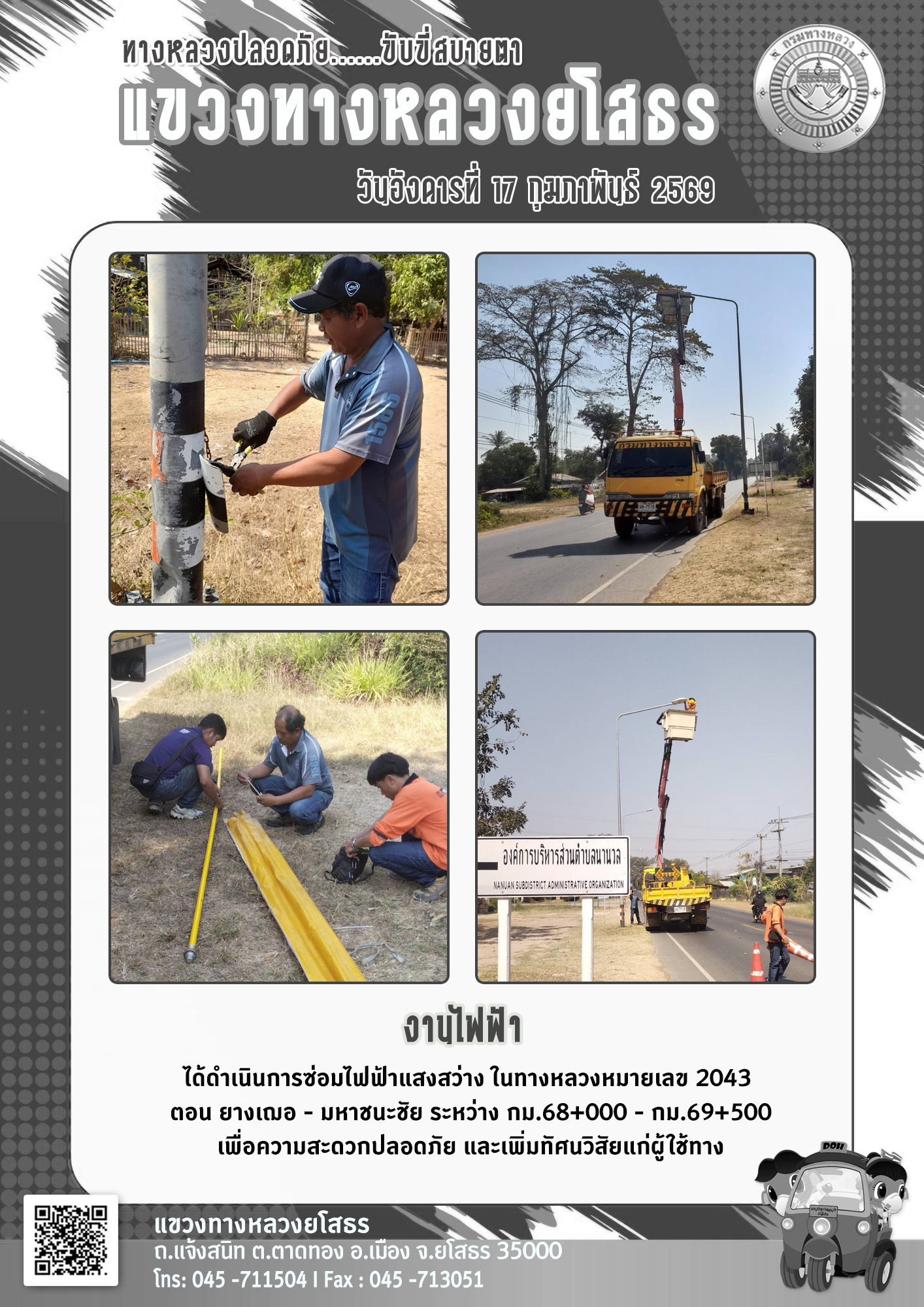 วันอังคารที่ 17 กุมภาพันธ์ 2569 งานไฟฟ้า ได้ดำเนินการซ่อมไฟฟ้าแสงสว่าง ในทางหลวงหมายเลข 2043 ตอน ยางเฌอ - มหาชนะชัย ระหว่าง กม.68+000 - กม.69+500 เพื่อความสะดวกปลอดภัย และเพิ่มทัศนวิสัยแก่ผู้ใช้ทาง