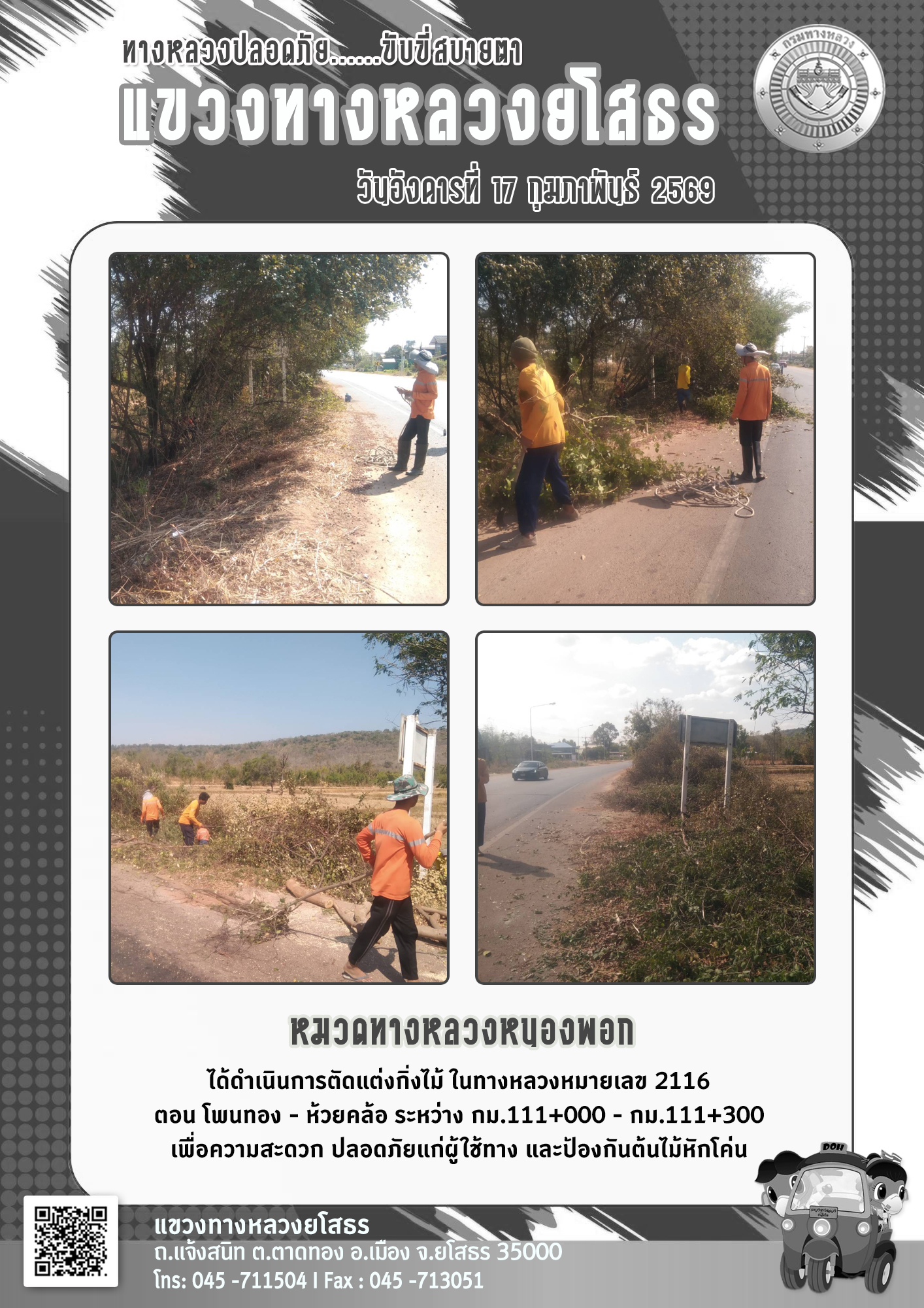 วันอังคารที่ 17 กุมภาพันธ์ 2569 หมวดทางหลวงหนองพอก ได้ดำเนินการตัดแต่งกิ่งไม้ ในทางหลวงหมายเลข 2116 ตอน โพนทอง - ห้วยคล้อ ระหว่าง กม.111+000 - กม.111+300 เพื่อความสะดวก ปลอดภัยแก่ผู้ใช้ทาง และป้องกันต้นไม้หักโค่น