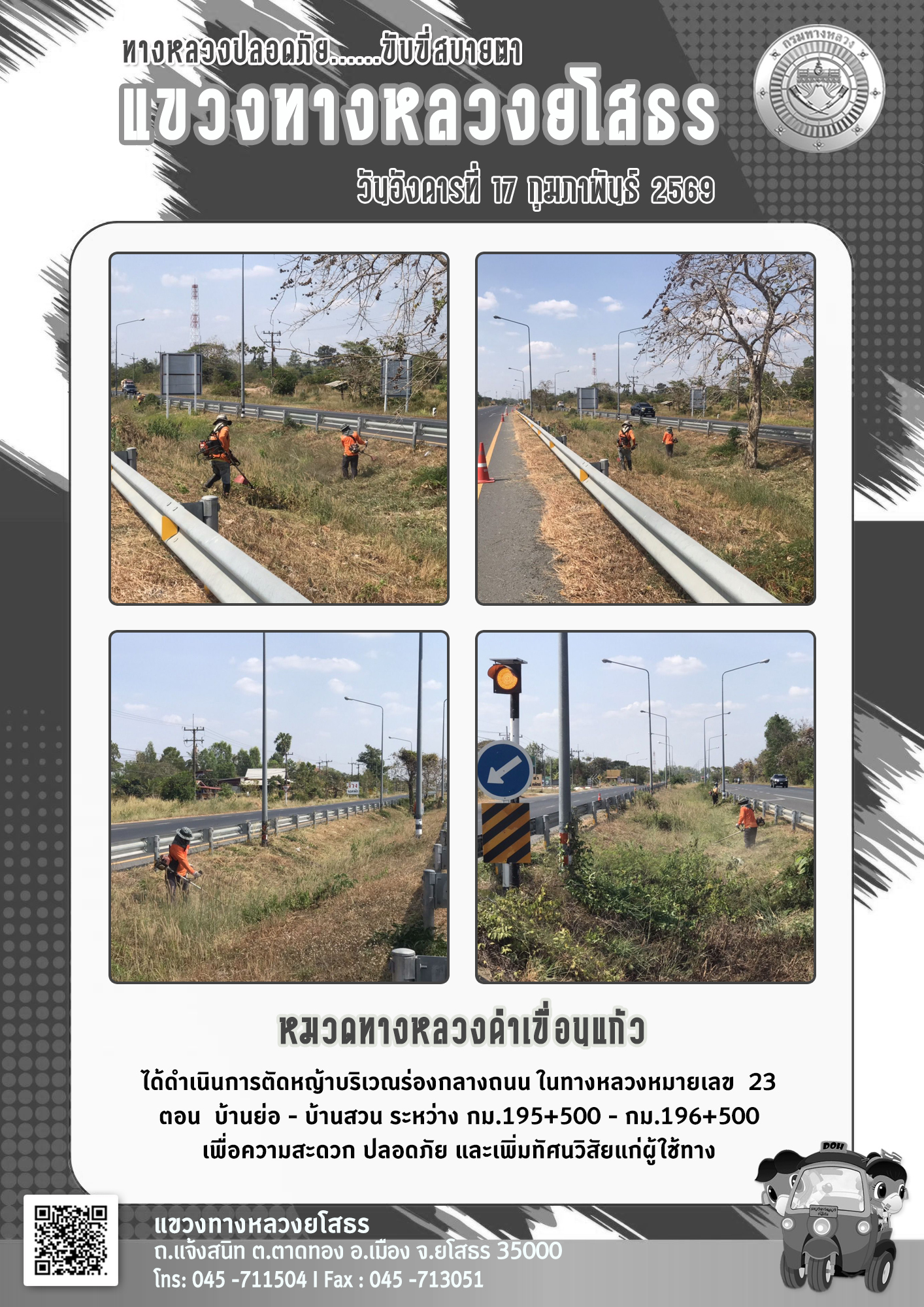 วันอังคารที่ 17 กุมภาพันธ์ 2569 หมวดทางหลวงคำเขื่อนแก้ว ได้ดำเนินการตัดหญ้าบริเวณร่องกลางถนน ในทางหลวงหมายเลข 23 ตอน บ้านย่อ - บ้านสวน ระหว่าง กม.195+500 - กม.196+500 เพื่อความสะดวก ปลอดภัย และเพิ่มทัศนวิสัยแก่ผู้ใช้ทาง