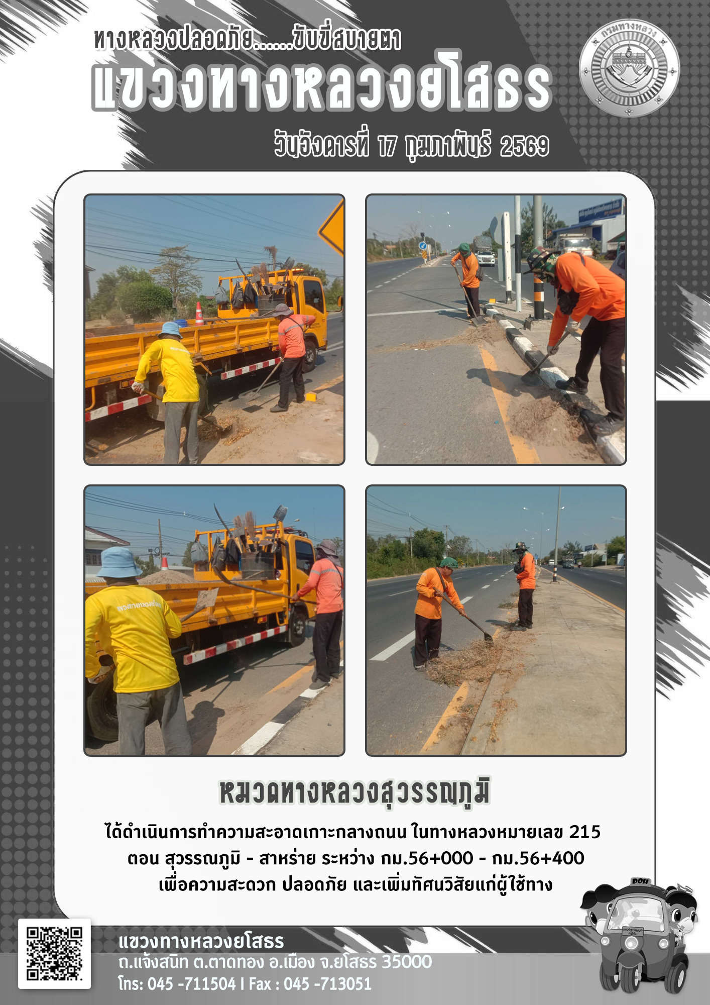 วันอังคารที่ 17 กุมภาพันธ์ 2569 หมวดทางหลวงสุวรรณภูมิ ได้ดำเนินการทำความสะอาดเกาะกลางถนน ในทางหลวงหมายเลข 215 ตอน สุวรรณภูมิ - สาหร่าย ระหว่าง กม.56+000 - กม.56+400 เพื่อความสะดวก ปลอดภัย และเพิ่มทัศนวิสัยแก่ผู้ใช้ทาง