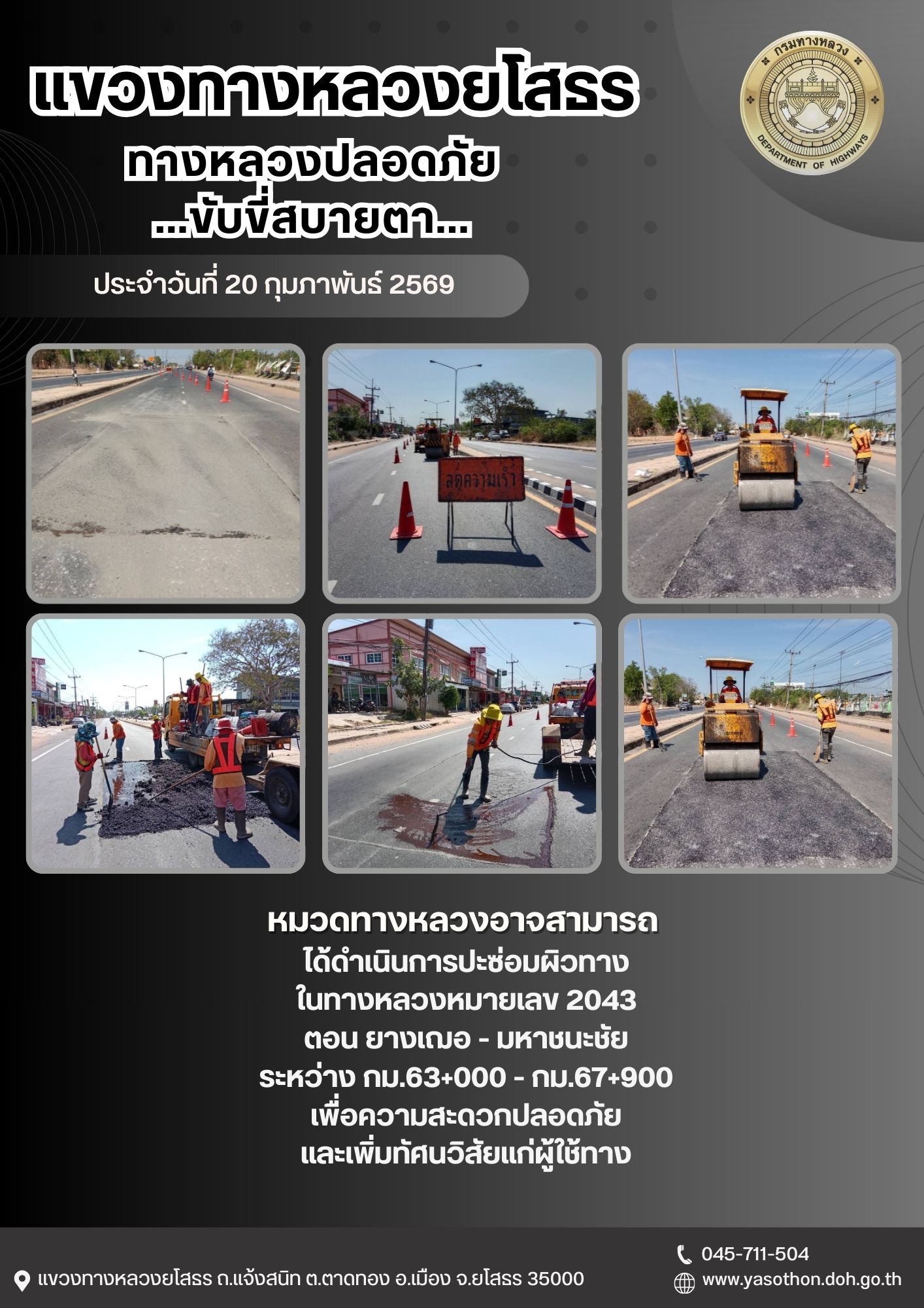 วันที่ 20 กุมภาพันธ์ 2569 หมวดทางหลวงอาจสามารถ ได้ดำเนินการปะซ่อมผิวทาง ในทางหลวงหมายเลข 2043 ตอน ยางเฌอ - มหาชนะชัย ระหว่าง กม.63+000 - กม.67+900 เพื่อความสะดวกปลอดภัย และเพิ่มทัศนวิสัยแก่ผู้ใช้ทาง