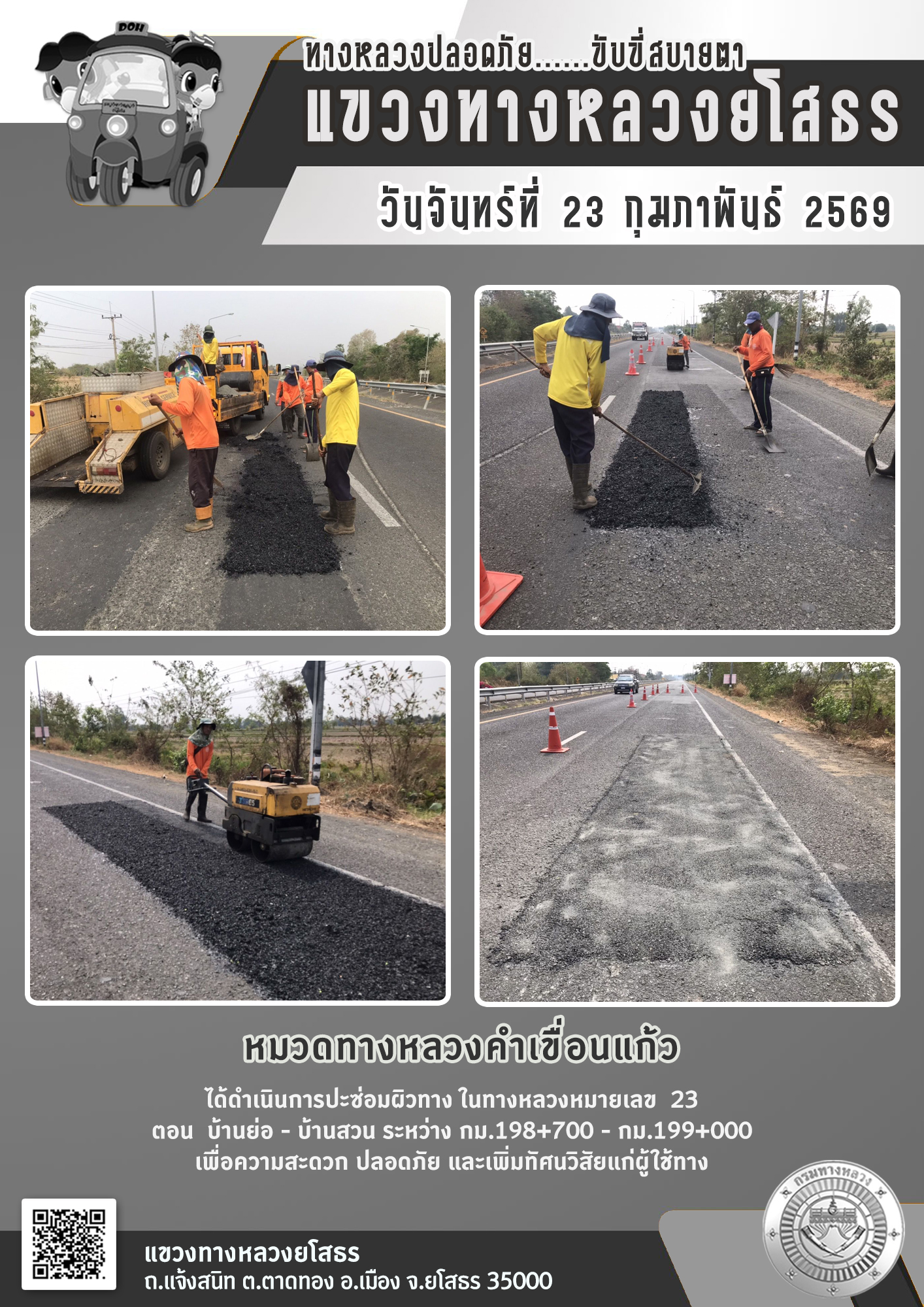 วันจันทร์ที่ 23 กุมภาพันธ์ 2569 หมวดทางหลวงคำเขื่อนแก้ว ได้ดำเนินการปะซ่อมผิวทาง ในทางหลวงหมายเลข 23 ตอน บ้านย่อ - บ้านสวน ระหว่าง กม.198+700 - กม.199+000 เพื่อความสะดวก ปลอดภัย และเพิ่มทัศนวิสัยแก่ผู้ใช้ทาง