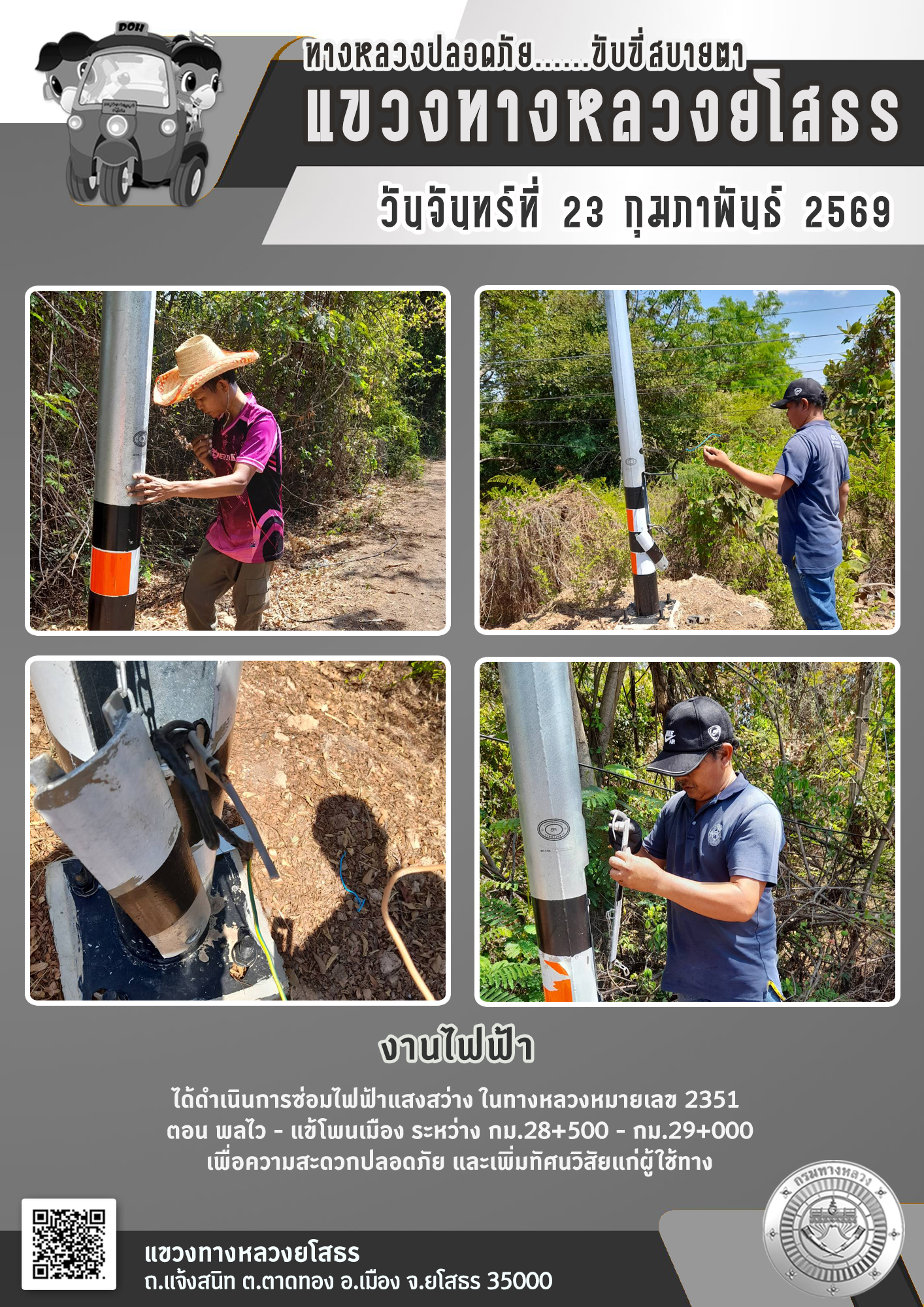 วันจันทร์ที่ 23 กุมภาพันธ์ 2569 งานไฟฟ้า ได้ดำเนินการซ่อมไฟฟ้าแสงสว่าง ในทางหลวงหมายเลข 2351 ตอน พลไว - แข้โพนเมือง ระหว่าง กม.28+500 - กม.29+000 เพื่อความสะดวกปลอดภัย และเพิ่มทัศนวิสัยแก่ผู้ใช้ทาง