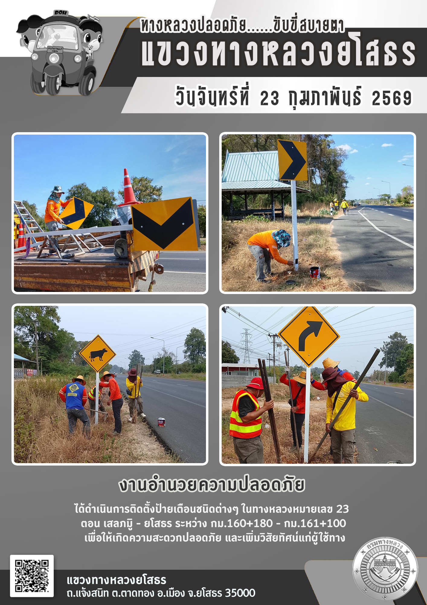 วันจันทร์ที่ 23 กุมภาพันธ์ 2569 งานอำนวยความปลอดภัย ได้ดำเนินการติดตั้งป้ายเตือนชนิดต่างๆ ในทางหลวงหมายเลข 23 ตอน เสลภมิ - ยโสธร ระหว่าง กม.160+180 - กม.161+100 เพื่อให้เกิดความสะดวกปลอดภัย และเพิ่มวิสัยทัศน์แก่ผู้ใช้ทาง