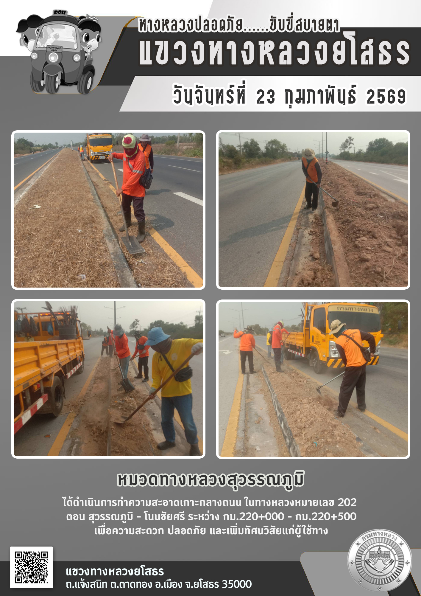 วันจันทร์ที่ 23 กุมภาพันธ์ 2569 หมวดทางหลวงสุวรรณภูมิ ได้ดำเนินการทำความสะอาดเกาะกลางถนน ในทางหลวงหมายเลข 202 ตอน สุวรรณภูมิ - โนนชัยศรี ระหว่าง กม.220+000 - กม.220+500 เพื่อความสะดวก ปลอดภัย และเพิ่มทัศนวิสัยแก่ผู้ใช้ทาง