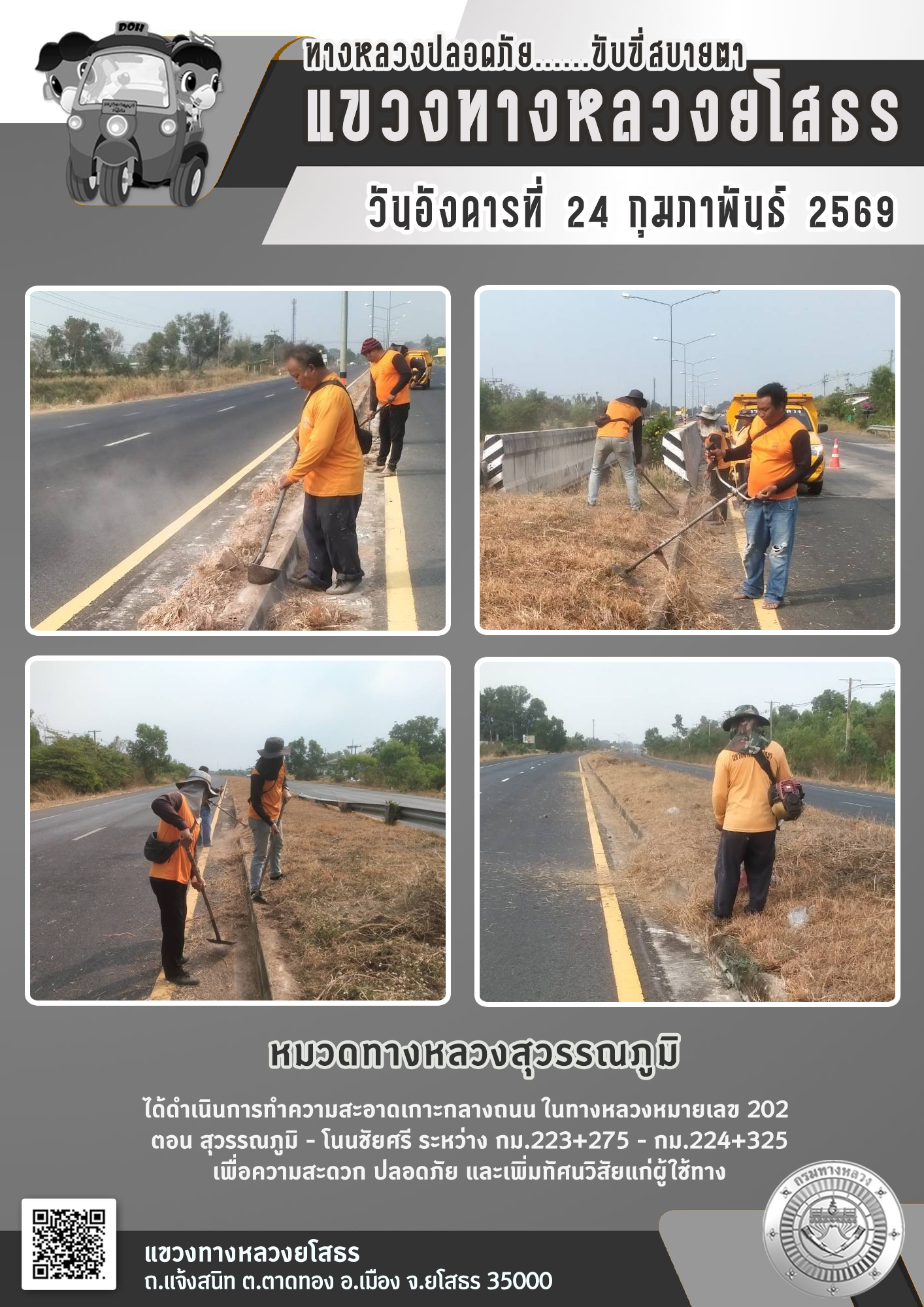 วันอังคารที่ 24 กุมภาพันธ์ 2569 หมวดทางหลวงสุวรรณภูมิ ได้ดำเนินการทำความสะอาดเกาะกลางถนน ในทางหลวงหมายเลข 202 ตอน สุวรรณภูมิ - โนนชัยศรี ระหว่าง กม.223+275 - กม.224+325 เพื่อความสะดวก ปลอดภัย และเพิ่มทัศนวิสัยแก่ผู้ใช้ทาง