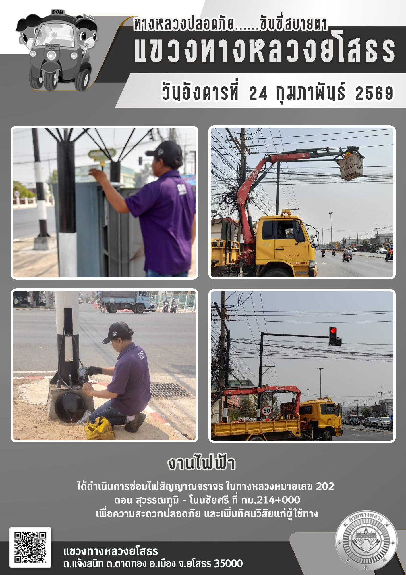 วันอังคารที่ 24 กุมภาพันธ์ 2569 งานไฟฟ้า ได้ดำเนินการซ่อมไฟสัญญาญาณจราจร ในทางหลวงหมายเลข 202 ตอน สุวรรณภูมิ - โนนชัยศรี ที่ กม.214+000 เพื่อความสะดวกปลอดภัย และเพิ่มทัศนวิสัยแก่ผู้ใช้ทาง