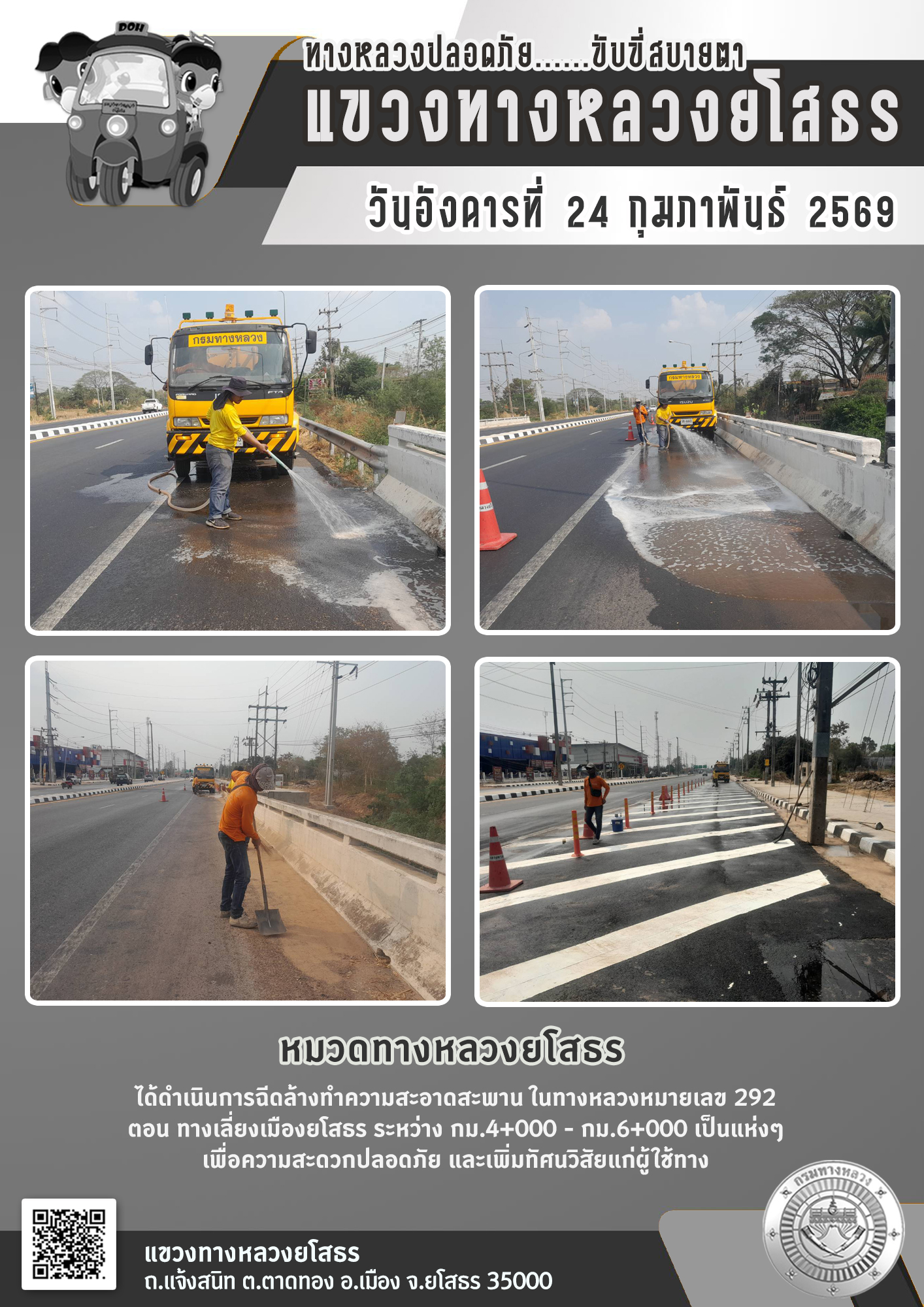 วันอังคารที่ 24 กุมภาพันธ์ 2569 หมวดทางหลวงยโสธร ได้ดำเนินการฉีดล้างทำความสะอาดสะพาน ในทางหลวงหมายเลข 292 ตอน ทางเลี่ยงเมืองยโสธร ระหว่าง กม.4+000 - กม.6+000 เป็นแห่งๆ เพื่อความสะดวกปลอดภัย และเพิ่มทัศนวิสัยแก่ผู้ใช้ทาง