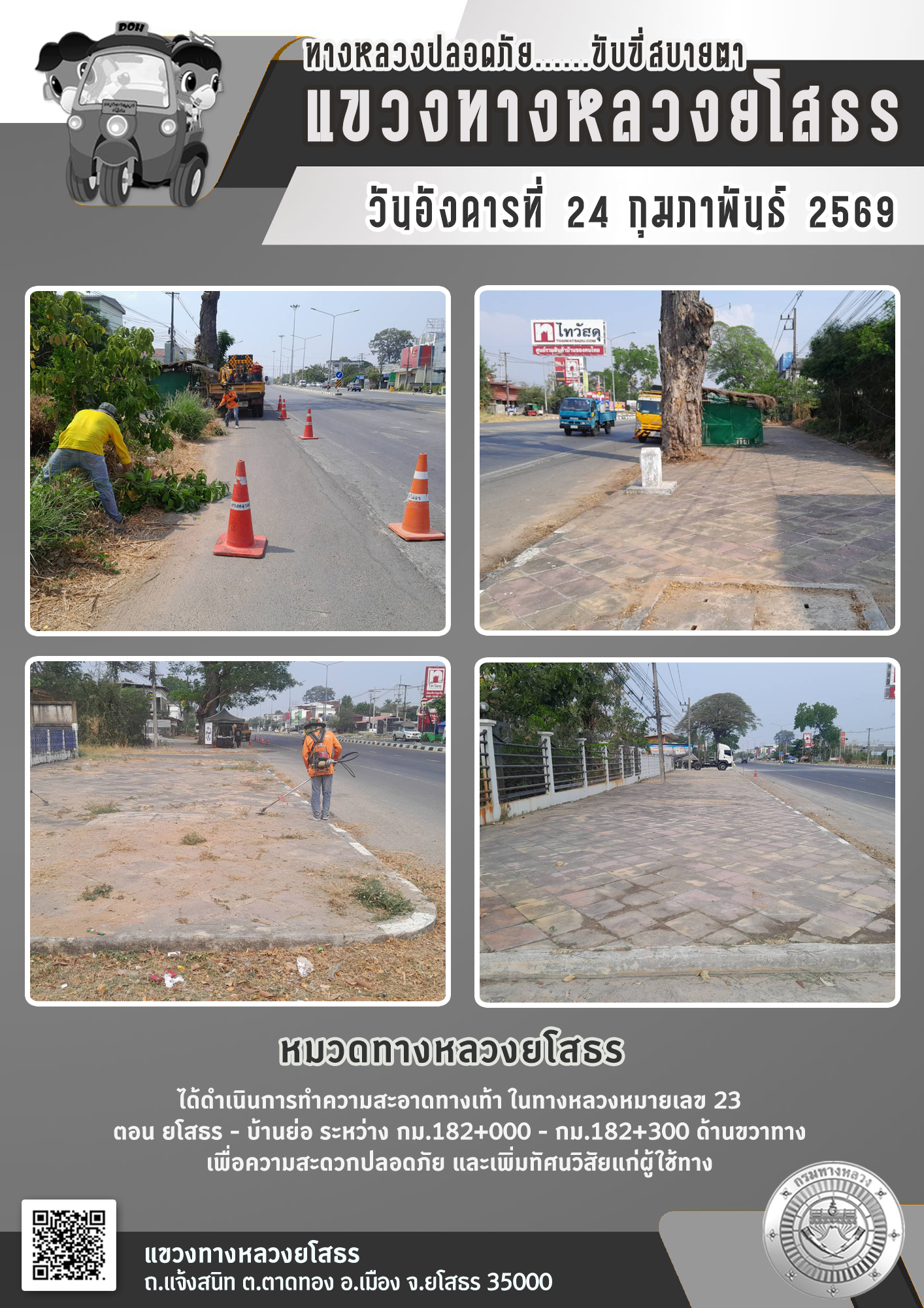 วันอังคารที่ 24 กุมภาพันธ์ 2569 หมวดทางหลวงยโสธร ได้ดำเนินการทำความสะอาดทางเท้า ในทางหลวงหมายเลข 23 ตอน ยโสธร - บ้านย่อ ระหว่าง กม.182+000 - กม.182+300 ด้านขวาทาง เพื่อความสะดวกปลอดภัย และเพิ่มทัศนวิสัยแก่ผู้ใช้ทาง