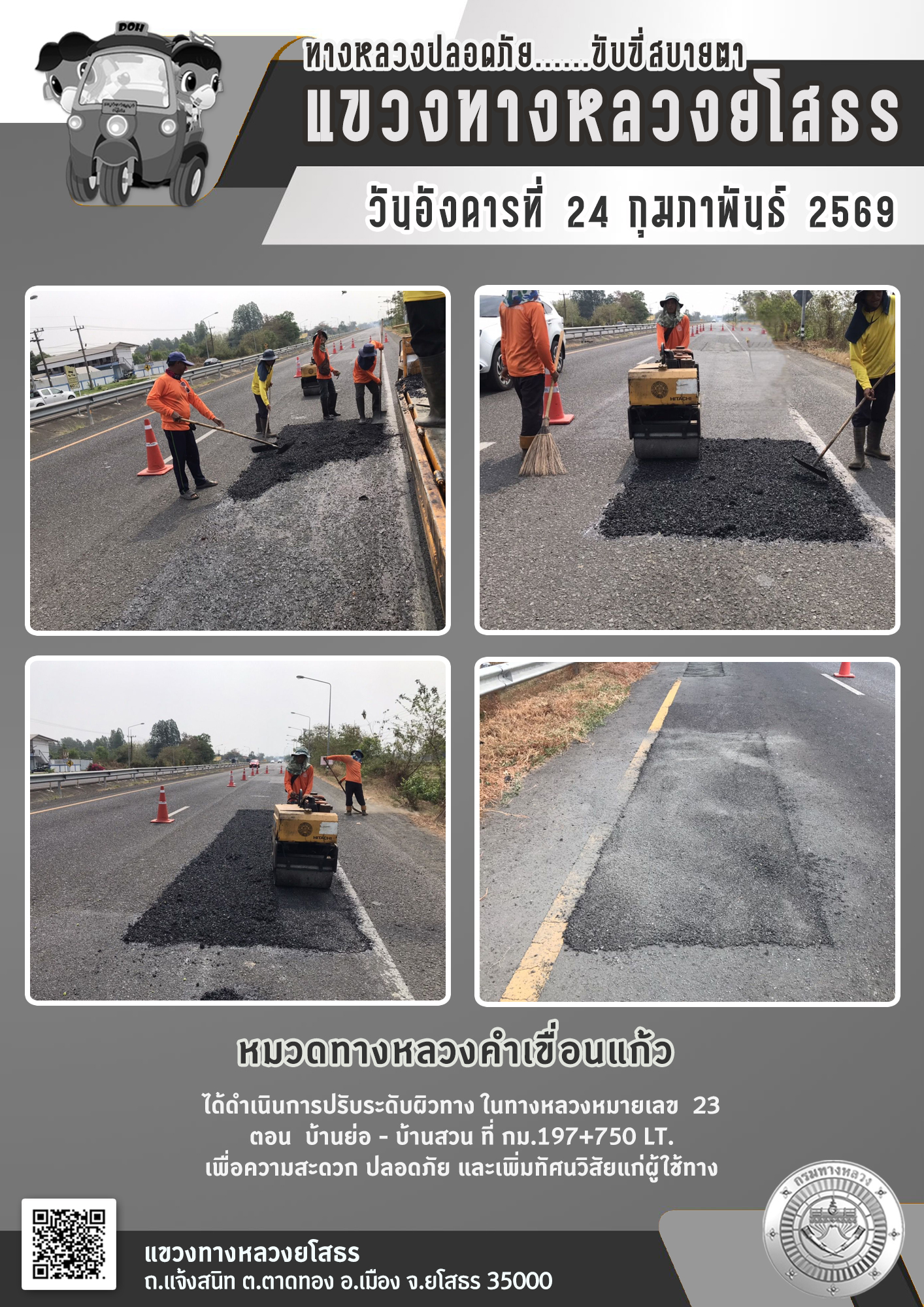 วันอังคารที่ 24 กุมภาพันธ์ 2569 หมวดทางหลวงคำเขื่อนแก้ว ได้ดำเนินการปรับระดับผิวทาง ในทางหลวงหมายเลข 23 ตอน บ้านย่อ - บ้านสวน ที่ กม.197+750 LT. เพื่อความสะดวก ปลอดภัย และเพิ่มทัศนวิสัยแก่ผู้ใช้ทาง
