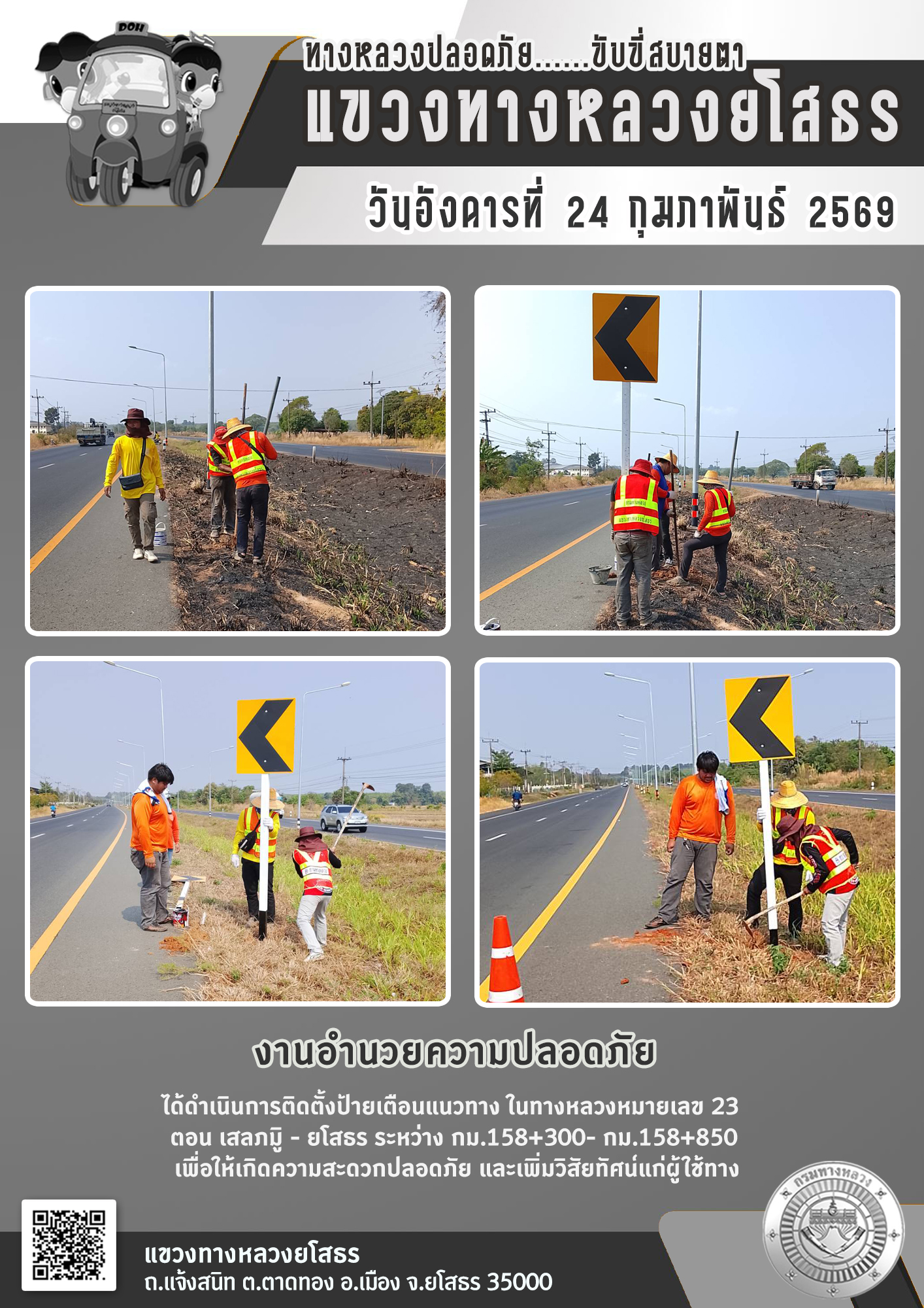 วันอังคารที่ 24 กุมภาพันธ์ 2569 งานอำนวยความปลอดภัย ได้ดำเนินการติดตั้งป้ายเตือนแนวทาง ในทางหลวงหมายเลข 23 ตอน เสลภมิ - ยโสธร ระหว่าง กม.158+300-กม.158+850 เพื่อให้เกิดความสะดวกปลอดภัย และเพิ่มวิสัยทัศน์แก่ผู้ใช้ทาง