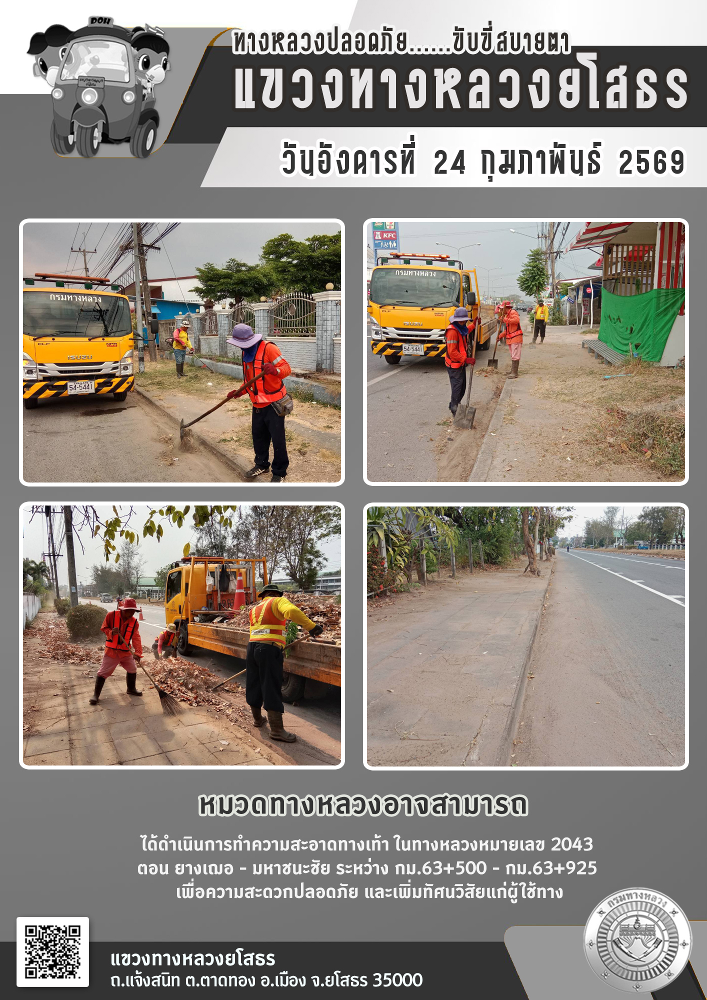 วันอังคารที่ 24 กุมภาพันธ์ 2569 หมวดทางหลวงอาจสามารถ ได้ดำเนินการทำความสะอาดทางเท้า ในทางหลวงหมายเลข 2043 ตอน ยางเฌอ - มหาชนะชัย ระหว่าง กม.63+500 - กม.63+925 เพื่อความสะดวกปลอดภัย และเพิ่มทัศนวิสัยแก่ผู้ใช้ทาง