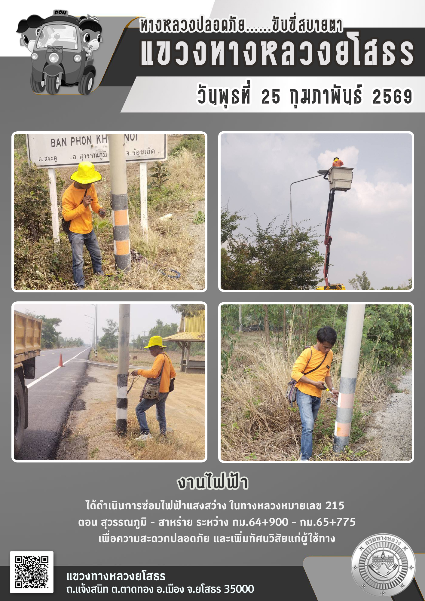 วันพุธที่ 25 กุมภาพันธ์ 2569 งานไฟฟ้า ได้ดำเนินการซ่อมไฟฟ้าแสงสว่าง ในทางหลวงหมายเลข 215 ตอน สุวรรณภูมิ - สาหร่าย ระหว่าง กม.64+900 - กม.65+775 เพื่อความสะดวกปลอดภัย และเพิ่มทัศนวิสัยแก่ผู้ใช้ทาง