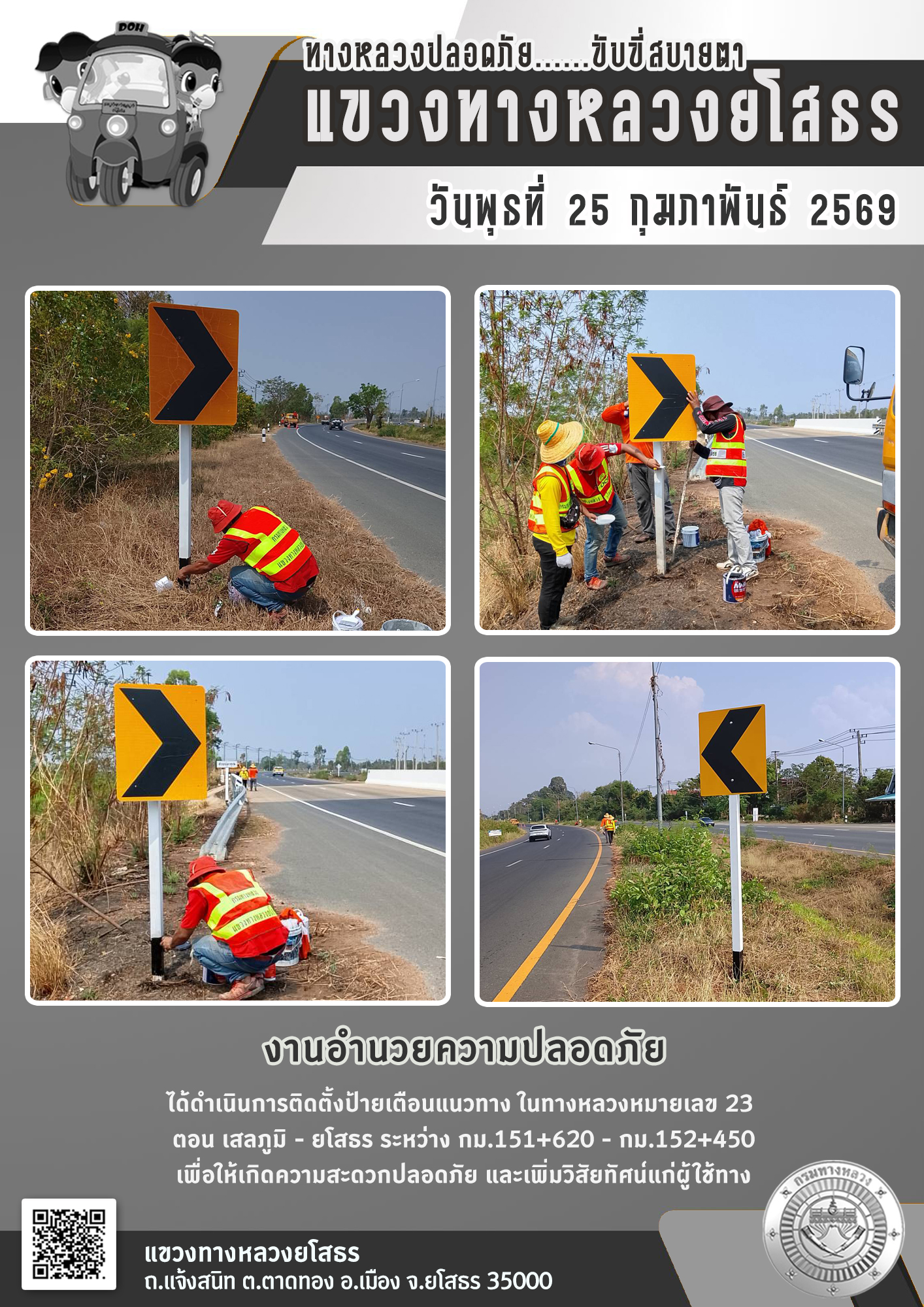 วันพุธที่ 25 กุมภาพันธ์ 2569 งานอำนวยความปลอดภัย ได้ดำเนินการติดตั้งป้ายเตือนแนวทาง ในทางหลวงหมายเลข 23 ตอน เสลภูมิ - ยโสธร ระหว่าง กม.151+620 - กม.152+450 เพื่อให้เกิดความสะดวกปลอดภัย และเพิ่มวิสัยทัศน์แก่ผู้ใช้ทาง