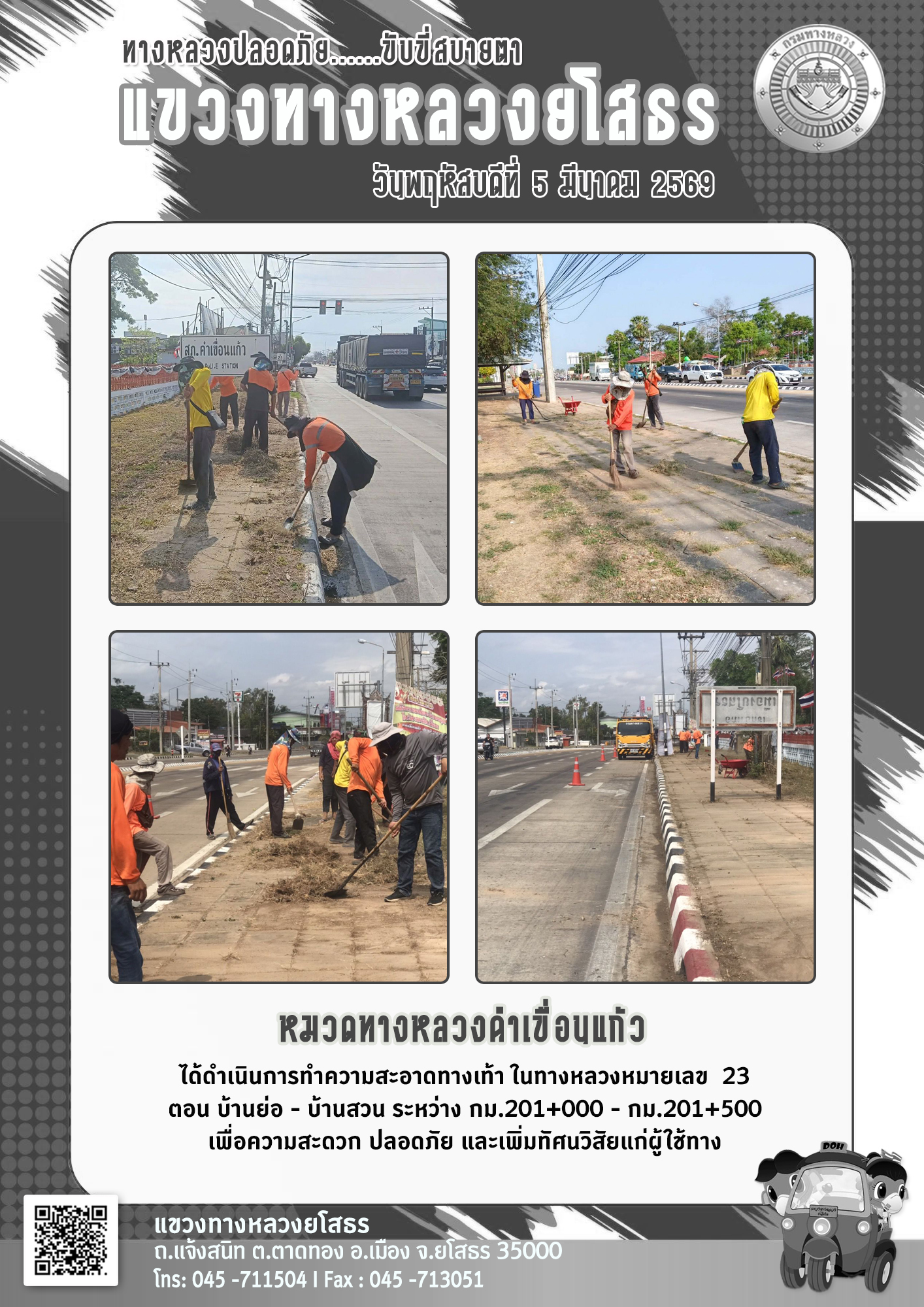 วันพฤหัสบดีที่ 5 มีนาคม 2569 หมวดทางหลวงคำเขื่อนแก้ว ได้ดำเนินการทำความสะอาดทางเท้า ในทางหลวงหมายเลข 23 ตอน บ้านย่อ - บ้านสวน ระหว่าง กม.201+000 - กม.201+500 เพื่อความสะดวก ปลอดภัย และเพิ่มทัศนวิสัยแก่ผู้ใช้ทาง