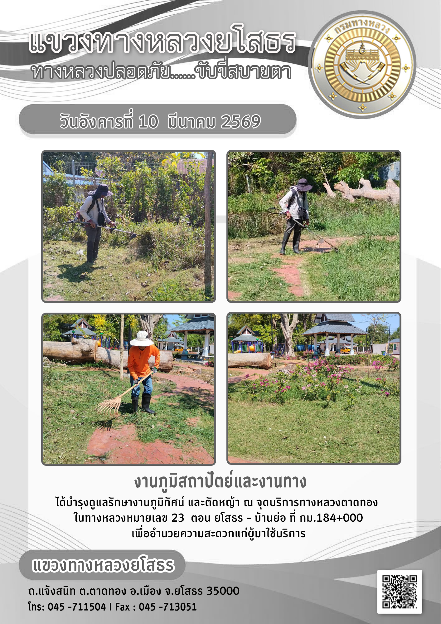 วันอังคารที่ 10 มีนาคม 2569 งานภูมิสถาปัตย์และงานทาง ได้บำรุงดูแลรักษางานภูมิทัศน์ และตัดหญ้า ณ จุดบริการทางหลวงตาดทอง ในทางหลวงหมายเลข 23 ตอน ยโสธร - บ้านย่อ ที่ กม.184+000 เพื่ออำนวยความสะดวกแก่ผู้มาใช้บริการ