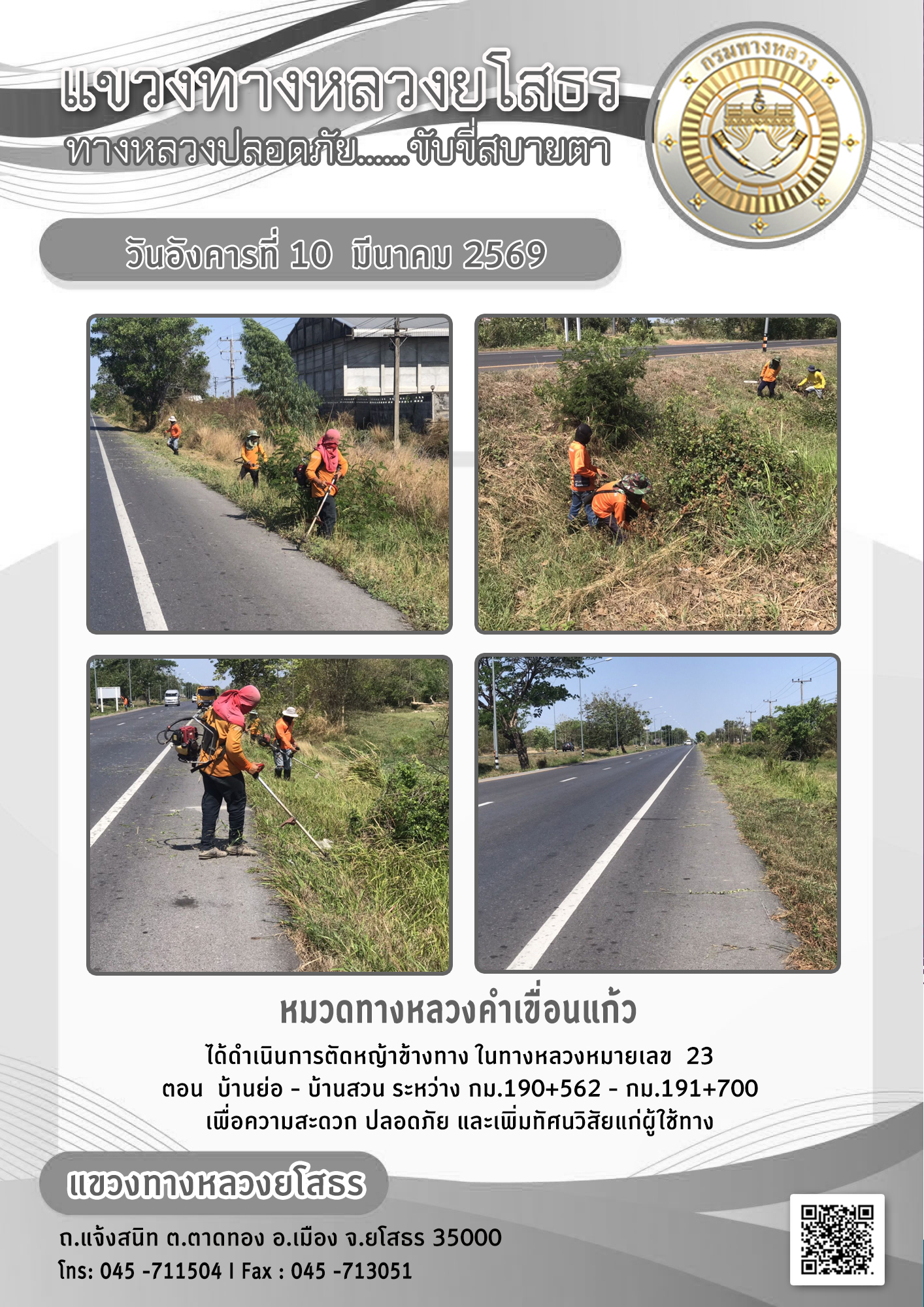 วันอังคารที่ 10 มีนาคม 2569 หมวดทางหลวงคำเขื่อนแก้ว ได้ดำเนินการตัดหญ้าข้างทาง ในทางหลวงหมายเลข 23 ตอน บ้านย่อ - บ้านสวน ระหว่าง กม.190+562 - กม.191+700 เพื่อความสะดวก ปลอดภัย และเพิ่มทัศนวิสัยแก่ผู้ใช้ทาง