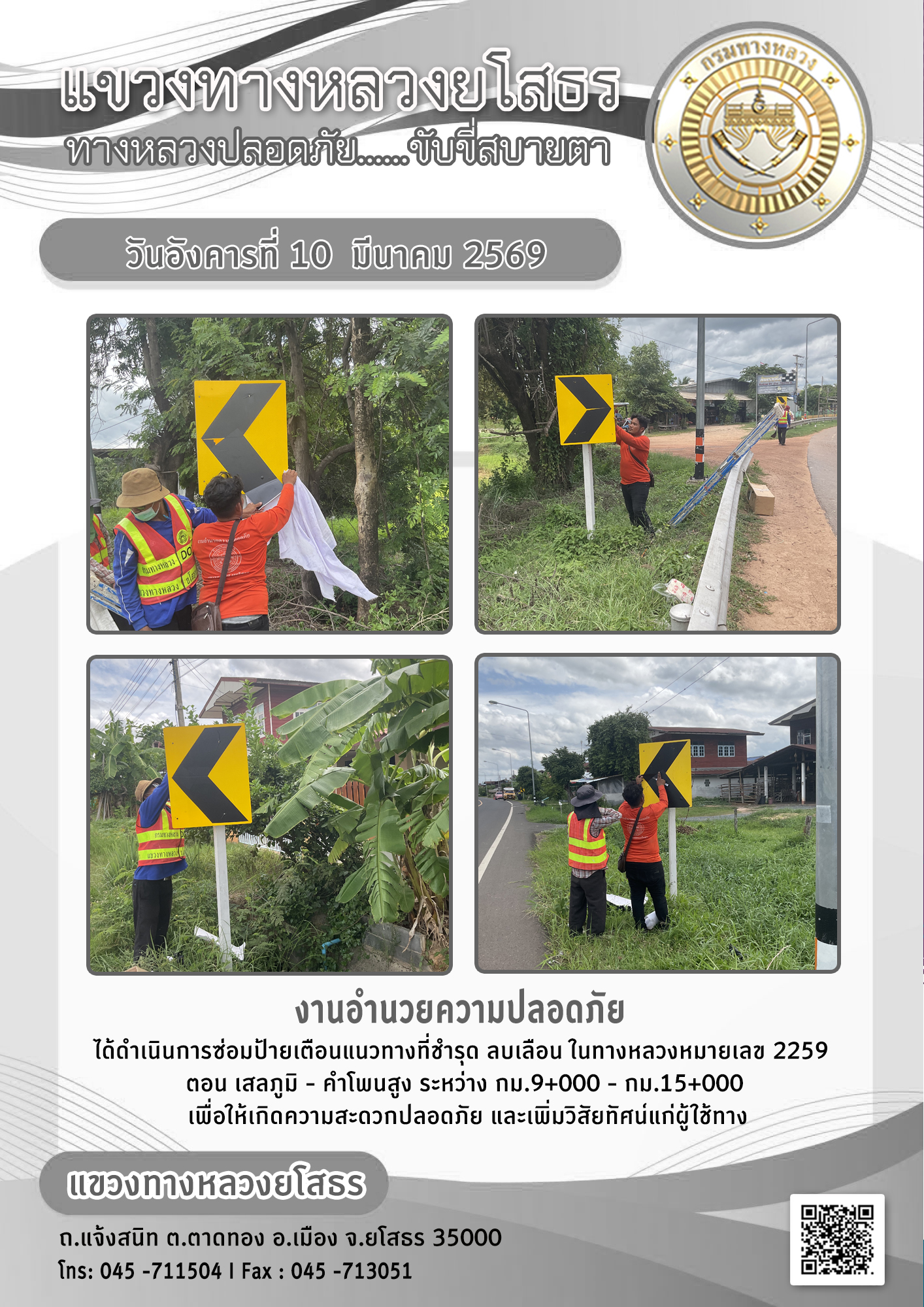 วันอังคารที่ 10 มีนาคม 2569 งานอำนวยความปลอดภัย ได้ดำเนินการซ่อมป้ายเตือนแนวทางที่ชำรุด ลบเลือน ในทางหลวงหมายเลข 2259 ตอน เสลภูมิ - คำโพนสูง ระหว่าง กม.9+000 - กม.15+000 เพื่อให้เกิดความสะดวกปลอดภัย และเพิ่มวิสัยทัศน์แก่ผู้ใช้ทาง