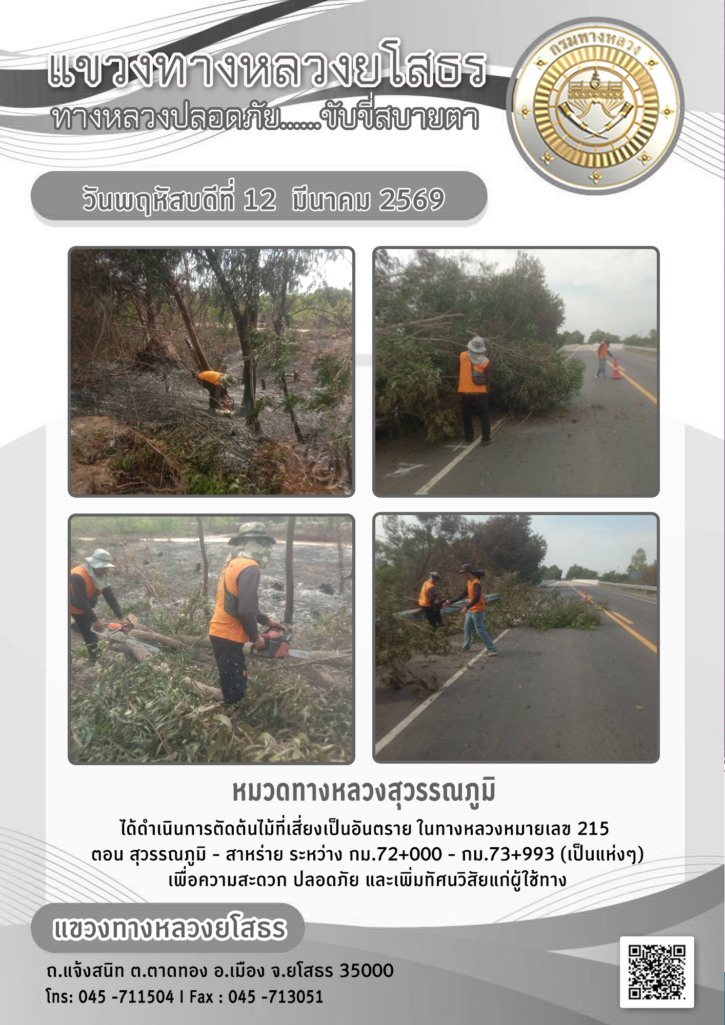 วันพฤหัสบดีที่ 12 มีนาคม 2569 หมวดทางหลวงสุวรรณภูมิ ได้ดำเนินการตัดต้นไม้ที่เสี่ยงเป็นอันตราย ในทางหลวงหมายเลข 215 ตอน สุวรรณภูมิ - สาหร่าย ระหว่าง กม.72+000 - กม.73+993 (เป็นแห่งๆ) เพื่อความสะดวก ปลอดภัย และเพิ่มทัศนวิสัยแก่ผู้ใช้ทาง