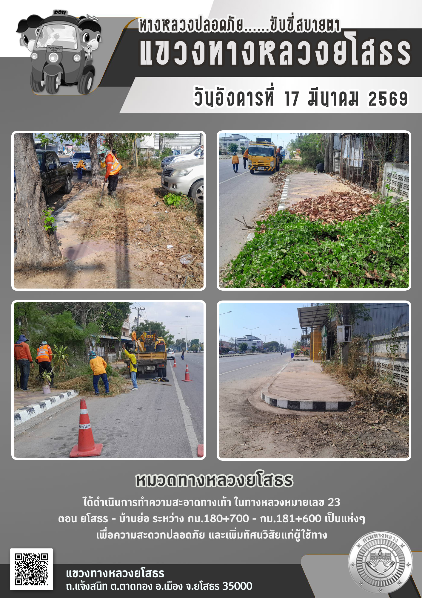 วันอังคารที่ 17 มีนาคม 2569 หมวดทางหลวงยโสธร ได้ดำเนินการทำความสะอาดทางเท้า ในทางหลวงหมายเลข 23 ตอน ยโสธร - บ้านย่อ ระหว่าง กม.180+700 - กม.181+600 เป็นแห่งๆ เพื่อความสะดวกปลอดภัย และเพิ่มทัศนวิสัยแก่ผู้ใช้ทาง