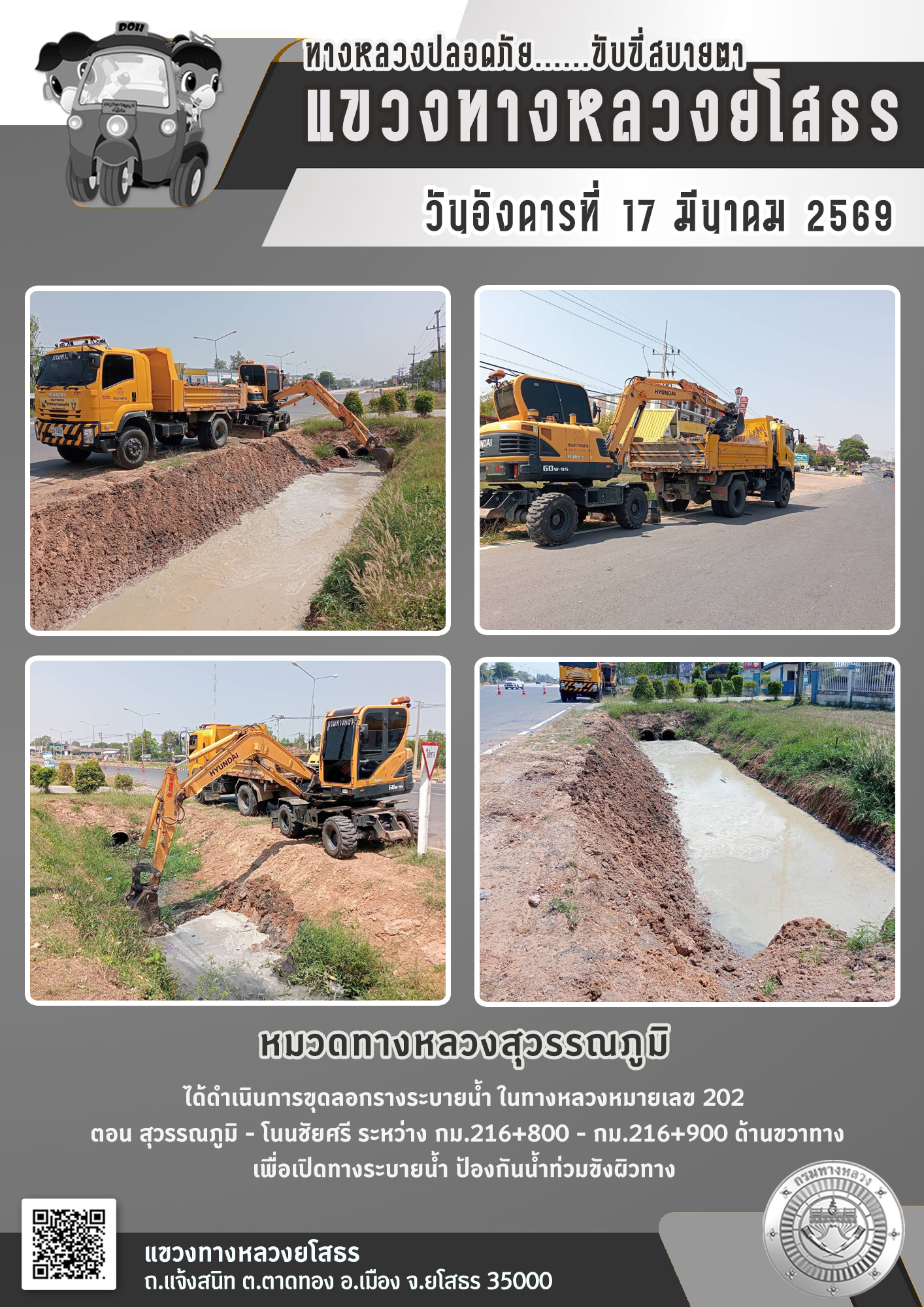 วันอังคารที่ 17 มีนาคม 2569 หมวดทางหลวงสุวรรณภูมิ ได้ดำเนินการขุดลอกรางระบายน้ำ ในทางหลวงหมายเลข 202 ตอน สุวรรณภูมิ - โนนชัยศรี ระหว่าง กม.216+800 - กม.216+900 ด้านขวาทาง เพื่อเปิดทางระบายน้ำ ป้องกันน้ำท่วมขังผิวทาง