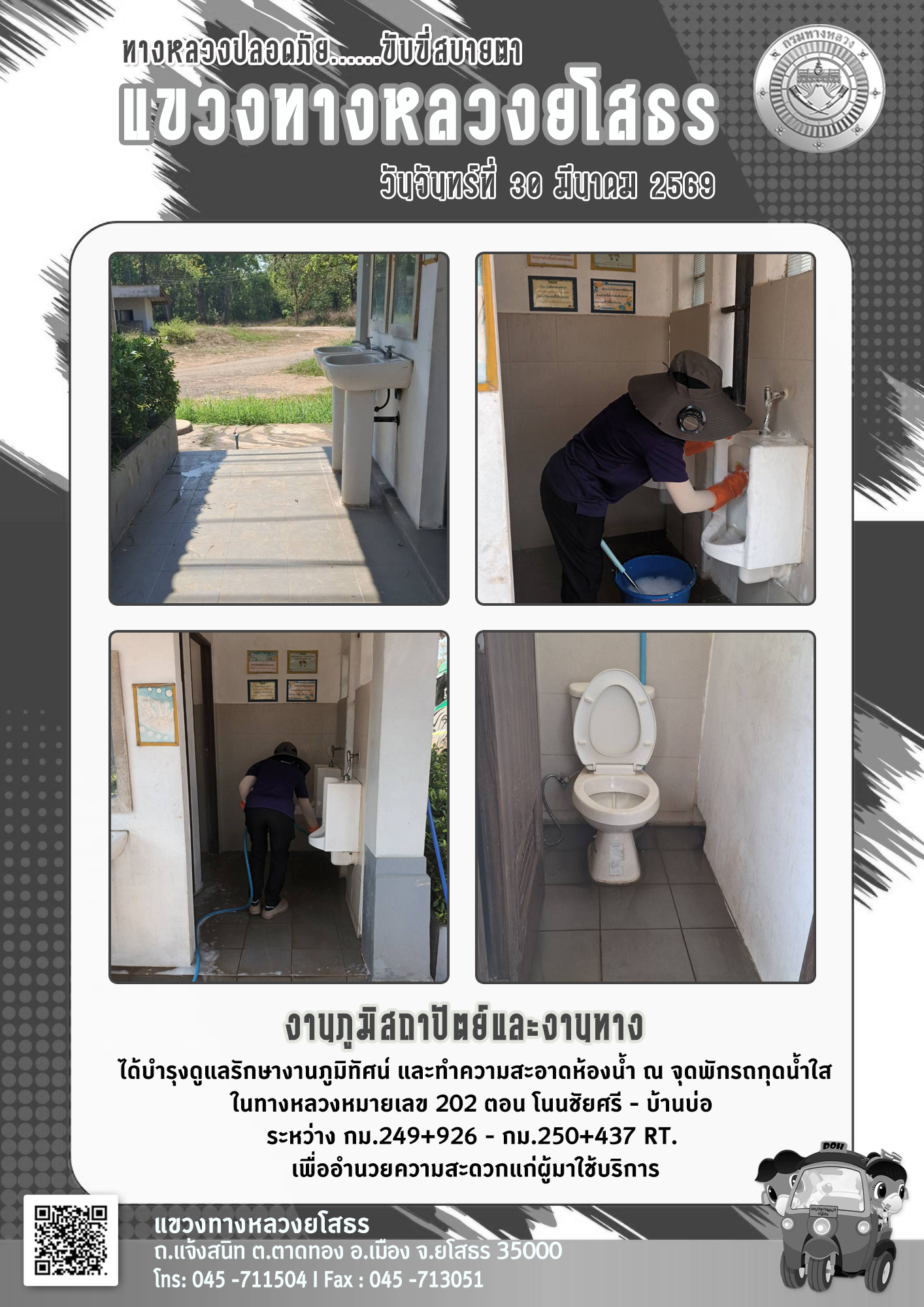 - [10:21] ทั่วไป วันอังคารที่ 31 มีนาคม 2569 งานอำนวยความปลอดภัย ได้ดำเนินการตัดหญ้า ทำความสะอาดภายในบริเวณแขวงทางหลวงยโสธร