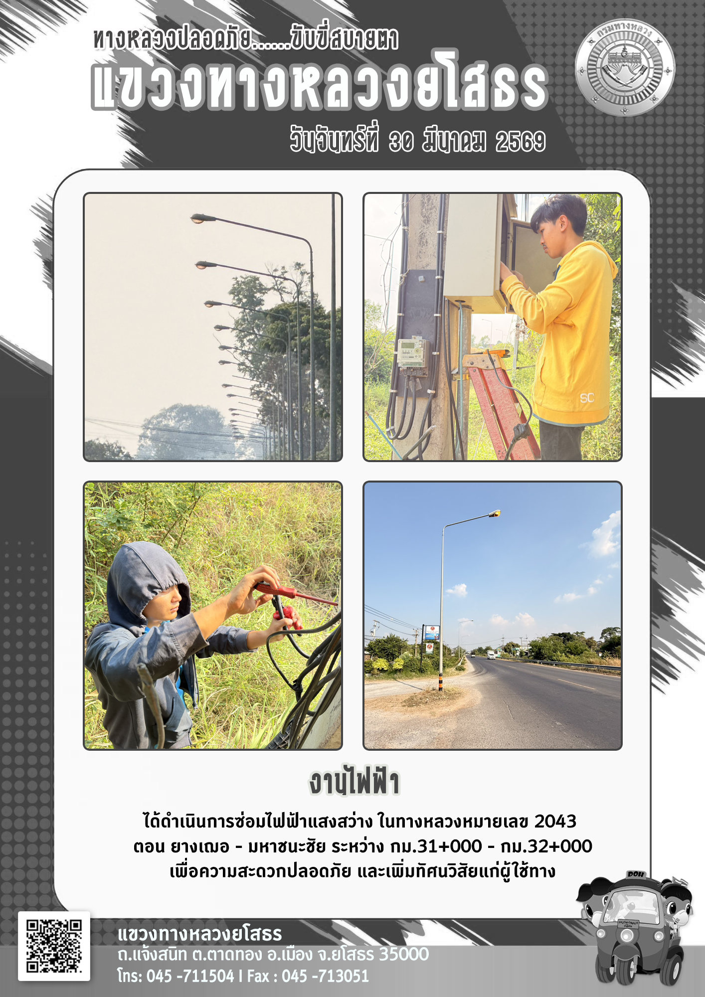 วันจันทร์ที่ 30 มีนาคม 2569 งานไฟฟ้า ได้ดำเนินการซ่อมไฟฟ้าแสงสว่าง ในทางหลวงหมายเลข 2043 ตอน ยางเฌอ - มหาชนะชัย ระหว่าง กม.31+000 - กม.32+000 เพื่อความสะดวกปลอดภัย และเพิ่มทัศนวิสัยแก่ผู้ใช้ทาง