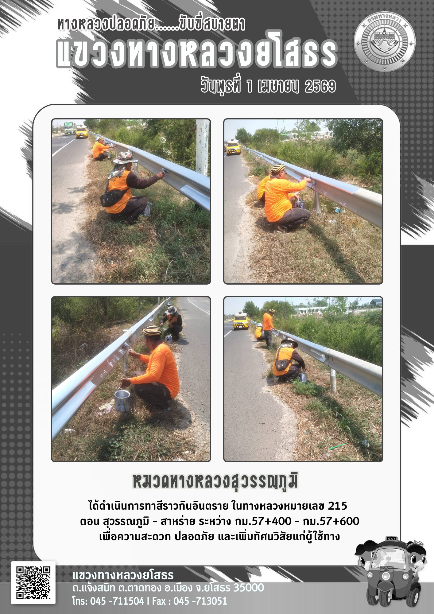 วันพุธที่ 1 เมษายน 2569 หมวดทางหลวงสุวรรณภูมิ ได้ดำเนินการทาสีราวกันอันตราย ในทางหลวงหมายเลข 215 ตอน สุวรรณภูมิ - สาหร่าย ระหว่าง กม.57+400 - กม.57+600 เพื่อความสะดวก ปลอดภัย และเพิ่มทัศนวิสัยแก่ผู้ใช้ทาง