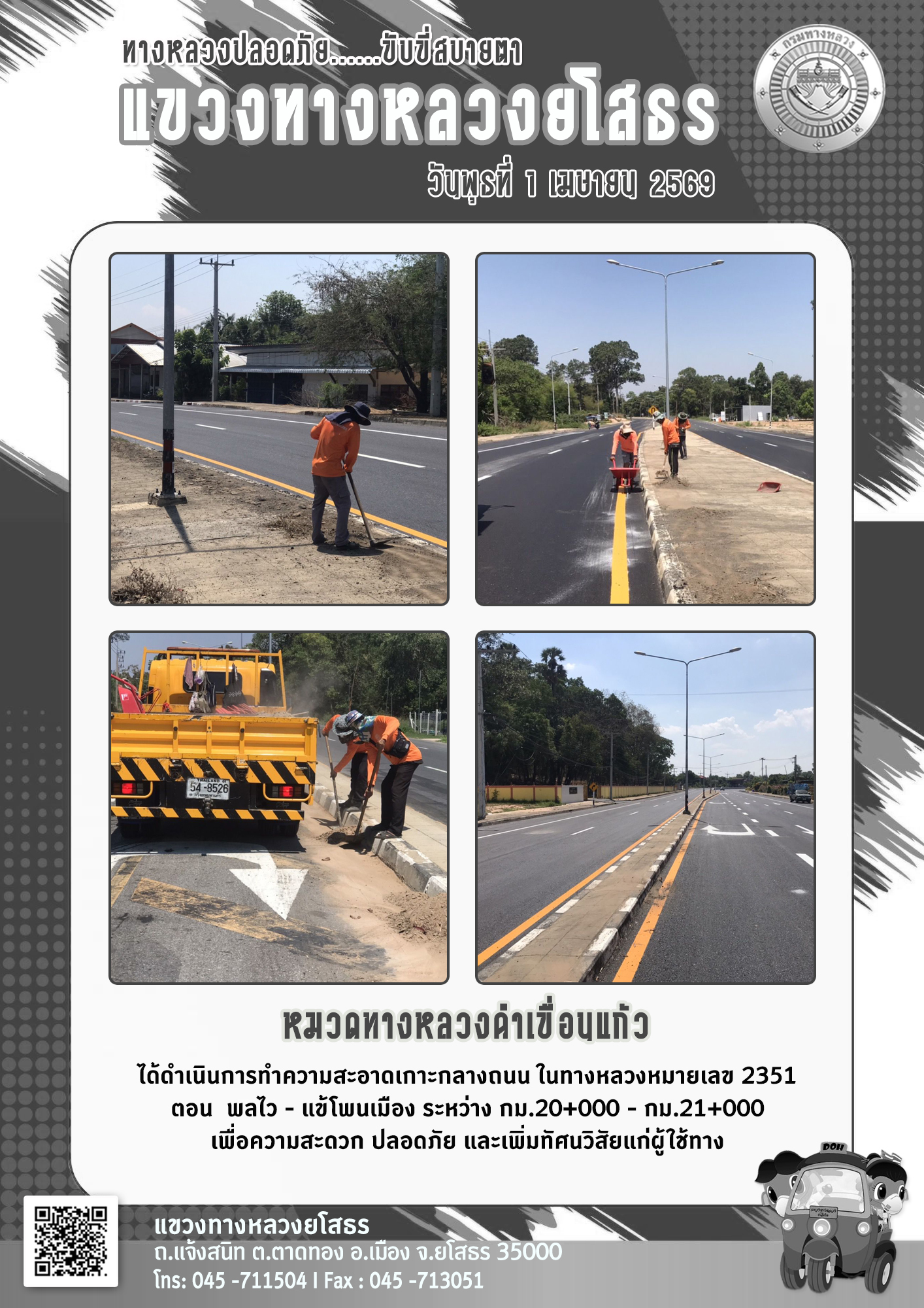 วันพุธที่ 1 เมษายน 2569 หมวดทางหลวงคำเขื่อนแก้ว ได้ดำเนินการทำความสะอาดเกาะกลางถนน ในทางหลวงหมายเลข 2351 ตอน พลไว - แข้โพนเมือง ระหว่าง กม.20+000 - กม.21+000 เพื่อความสะดวก ปลอดภัย และเพิ่มทัศนวิสัยแก่ผู้ใช้ทาง