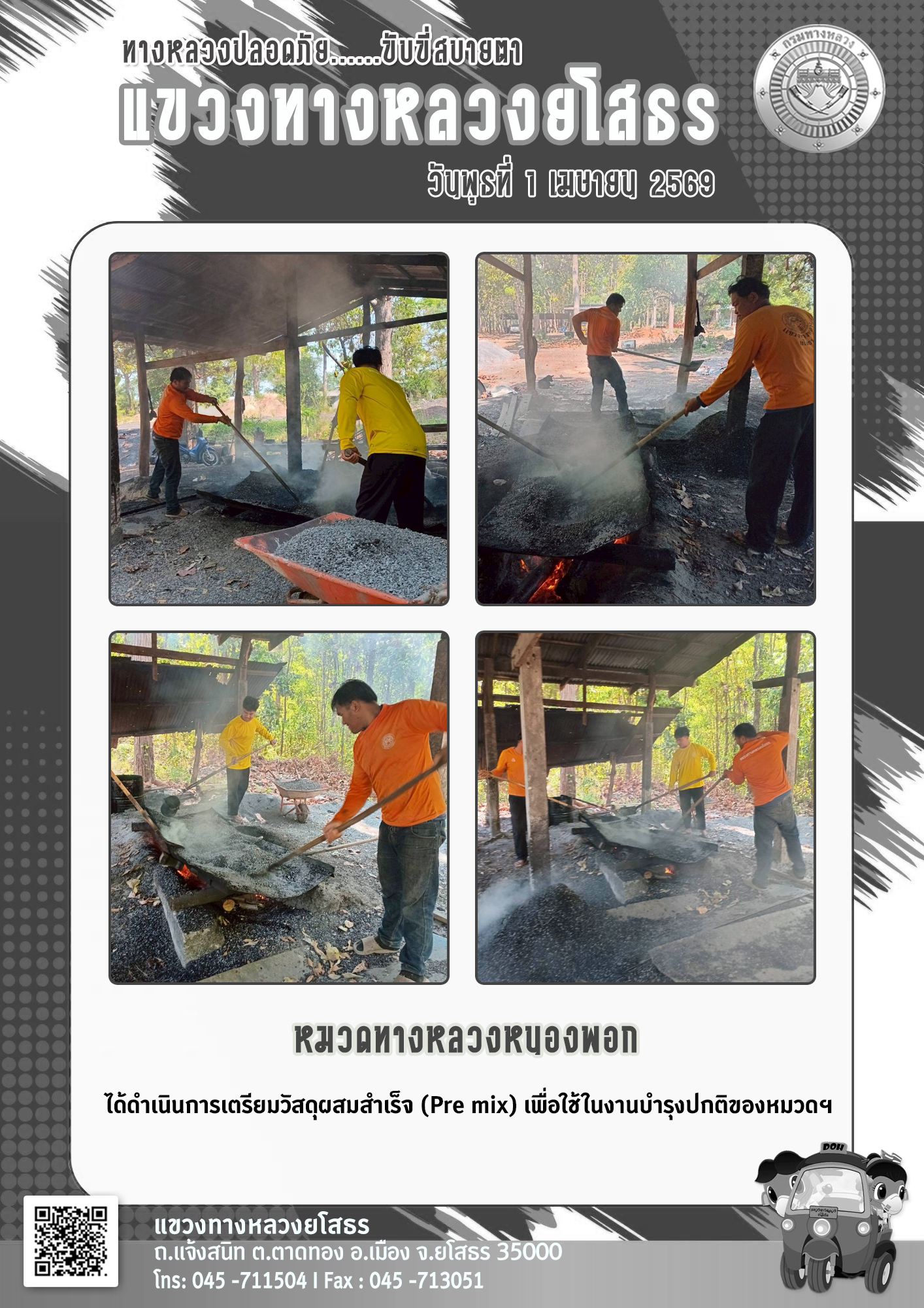 วันพุธที่ 1 เมษายน 2569 หมวดทางหลวงหนองพอก ได้ดำเนินการเตรียมวัสดุผสมสำเร็จ (Pre mix) เพื่อใช้ในงานบำรุงปกติของหมวดฯ