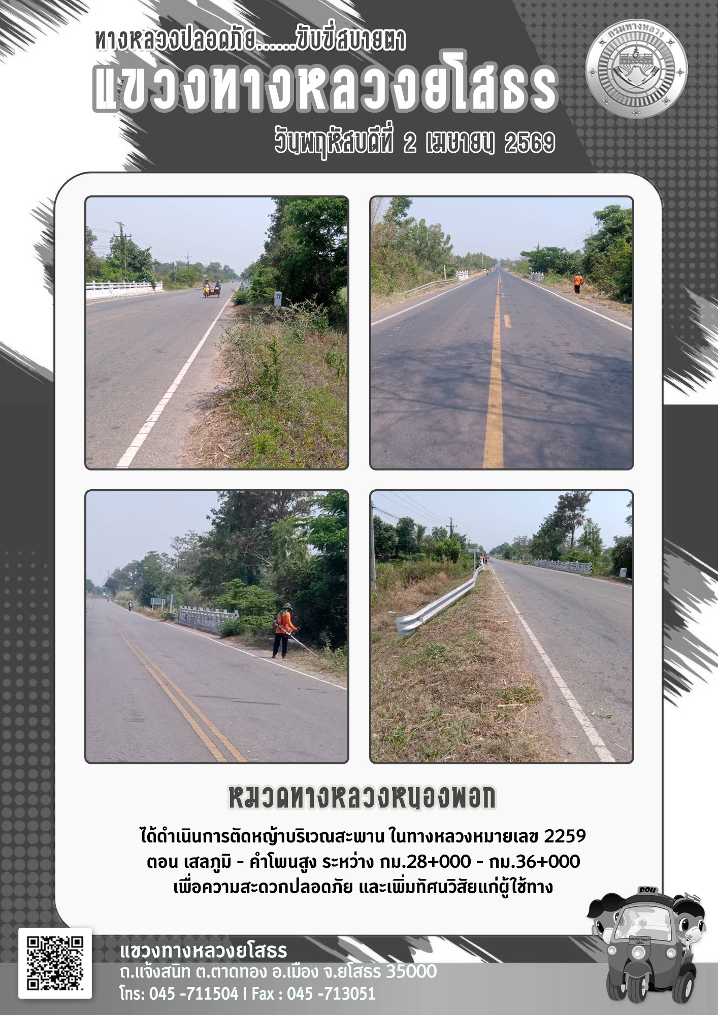 วันพฤหัสบดีที่ 2 เมษายน 2569 หมวดทางหลวงหนองพอก ได้ดำเนินการตัดหญ้าบริเวณสะพาน ในทางหลวงหมายเลข 2259 ตอน เสลภูมิ - คำโพบสูง ระหว่าง กม.28+000 - กม.36+000 เพื่อความสะดวกปลอดภัย และเพิ่มทัศนวิสัยแก่ผู้ใช้ทาง
