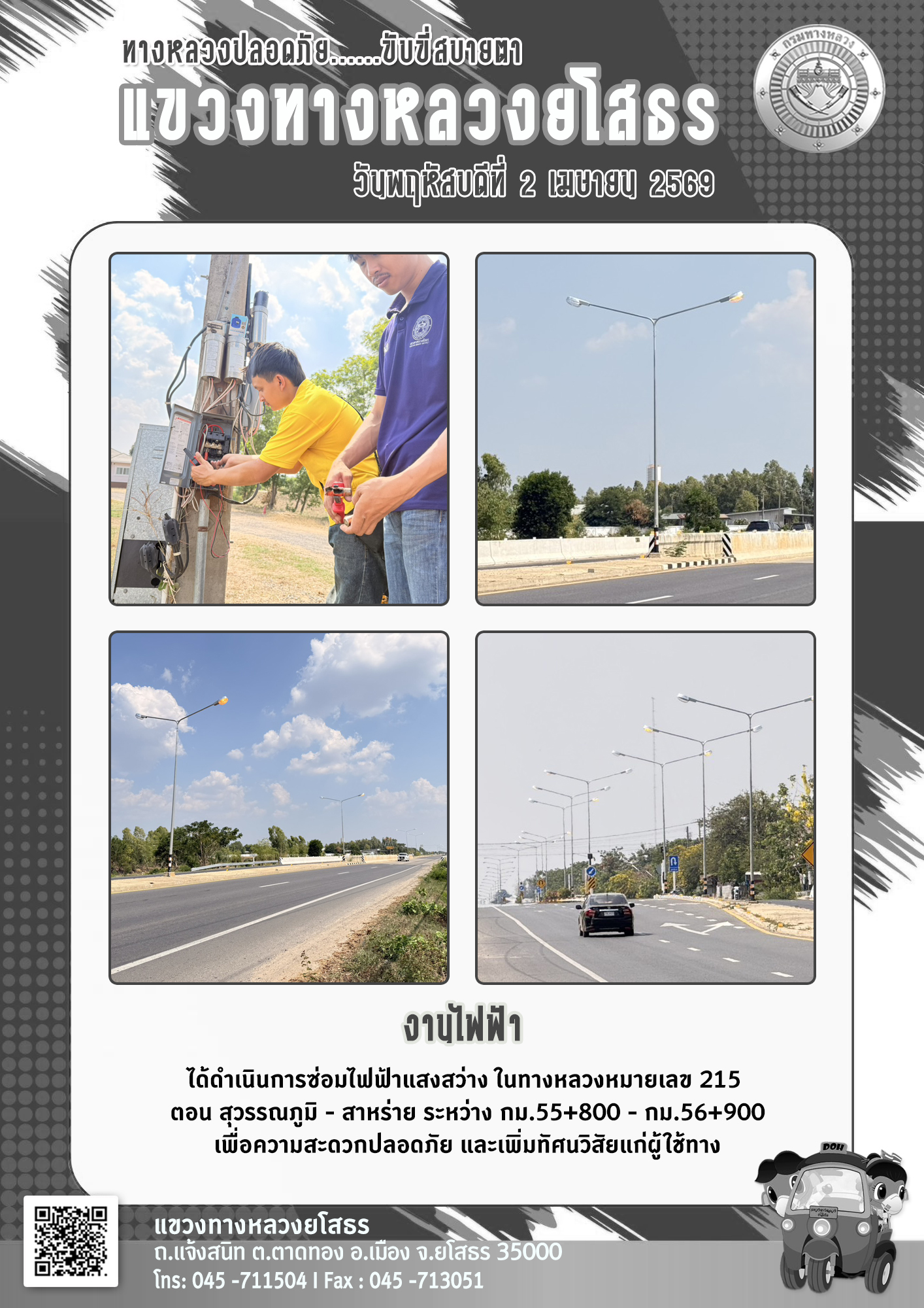 วันพฤหัสบดีที่ 2 เมษายน 2569 งานไฟฟ้า ได้ดำเนินการซ่อมไฟฟ้าแสงสว่าง ในทางหลวงหมายเลข 215 ตอน สุวรรณภูมิ - สาหร่าย ระหว่าง กม.55+800 - กม.56+900 เพื่อความสะดวกปลอดภัย และเพิ่มทัศนวิสัยแก่ผู้ใช้ทาง