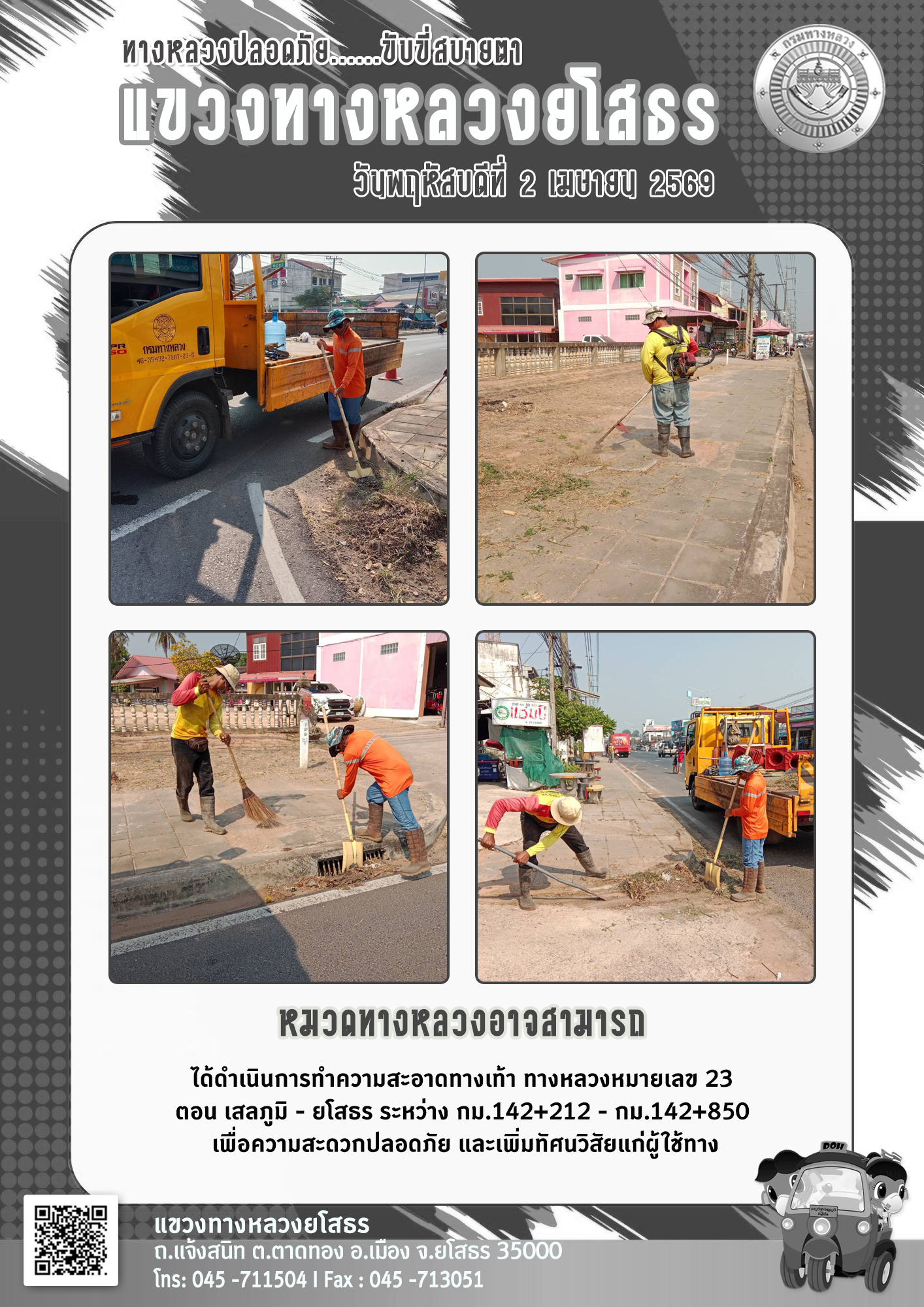 - [16:03] ทั่วไป วันพฤหัสบดีที่ 2 เมษายน 2569 หมวดทางหลวงอาจสามารถ ได้ดำเนินการทำความสะอาดทางเท้า ในทางหลวงหมายเลข 23 ตอน เสลภูมิ - ยโสธร ระหว่าง กม.142+212 - กม.142+850 เพื่อความสะดวกปลอดภัย และเพิ่มทัศนวิสัยแก่ผู้ใช้ทาง