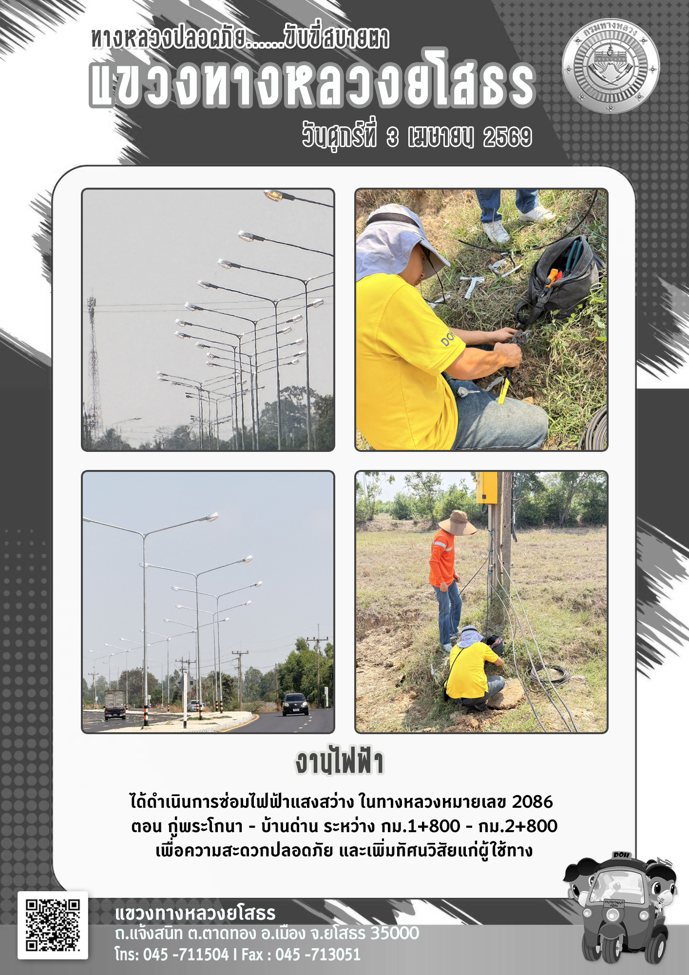 วันศุกร์ที่ 3 เมษายน 2569 งานไฟฟ้า ได้ดำเนินการซ่อมไฟฟ้าแสงสว่าง ในทางหลวงหมายเลข 2086 ตอน กู่พระโกนา - บ้านด่าน ระหว่าง กม.1+800 - กม.2+800 เพื่อความสะดวกปลอดภัย และเพิ่มทัศนวิสัยแก่ผู้ใช้ทาง