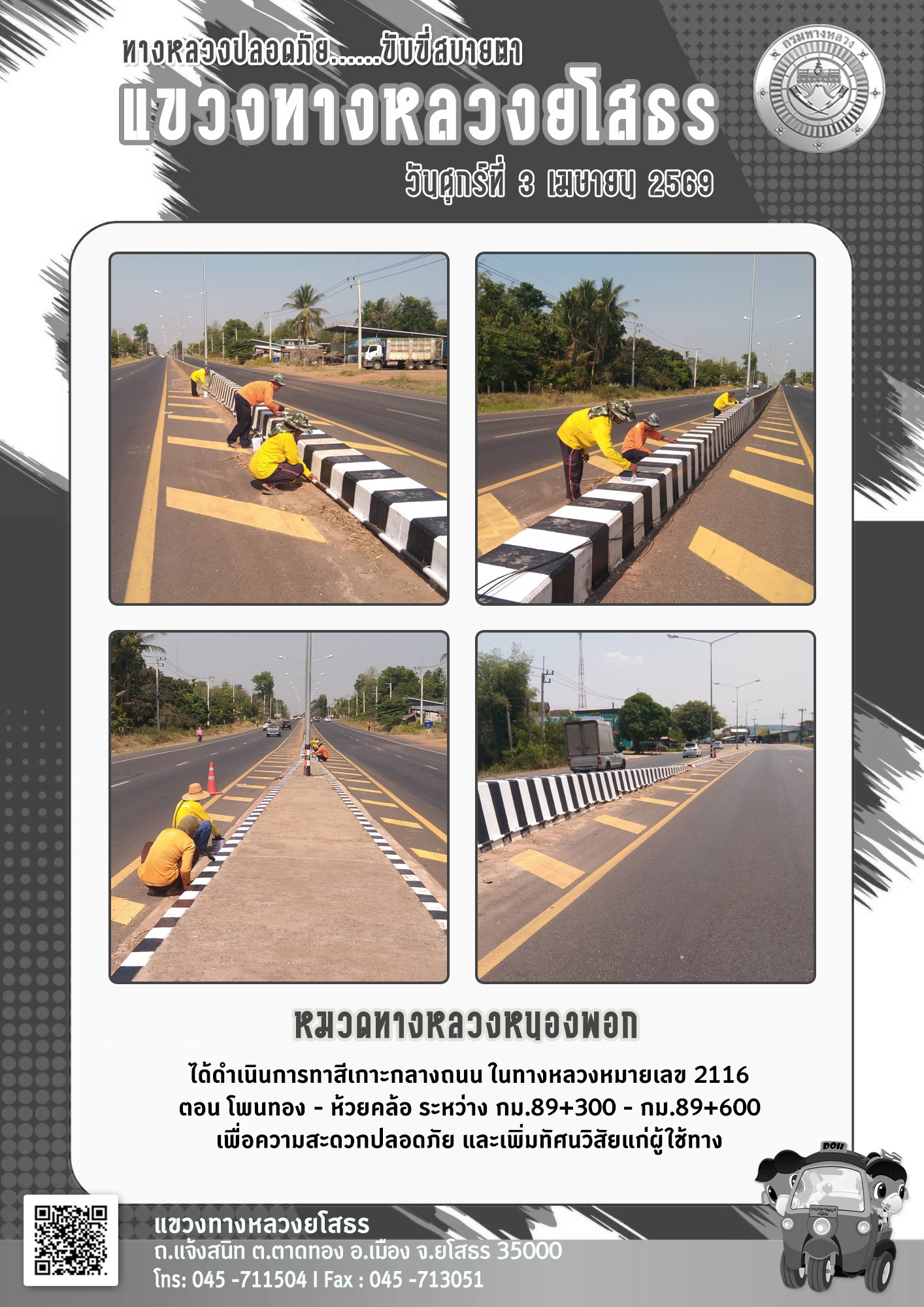 วันศุกร์ที่ 3 เมษายน 2569 หมวดทางหลวงหนองพอก ได้ดำเนินการทาสีเกาะกลางถนน ในทางหลวงหมายเลข 2116 ตอน โพนทอง - ห้วยคล้อ ระหว่าง กม.89+300 - กม.89+600 เพื่อความสะดวกปลอดภัย และเพิ่มทัศนวิสัยแก่ผู้ใช้ทาง
