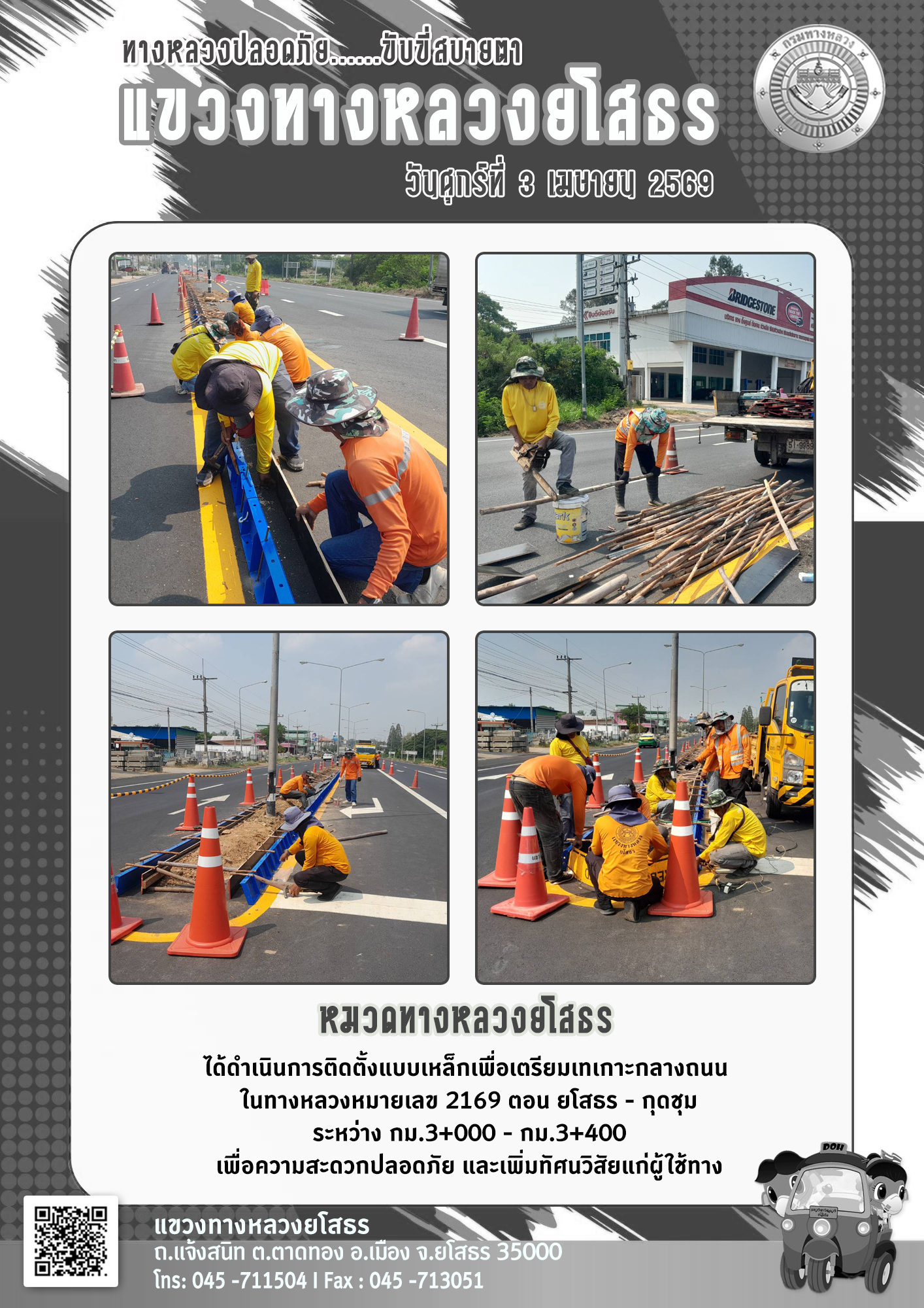 - [15:59] ทั่วไป วันพฤหัสบดีที่ 2 เมษายน 2569 หมวดทางหลวงยโสธร ได้ดำเนินการติดตั้งแบบเหล็กเพื่อเตรียมเทเกาะกลางถนน ในทางหลวงหมายเลข 2169 ตอน ยโสรร - กุดชุม ระหว่าง กม.3+000 - กม.3+400 เพื่อความสะดวกปลอดภัย และเพิ่มทัศนวิสัยแก่ผู้ใช้ทาง