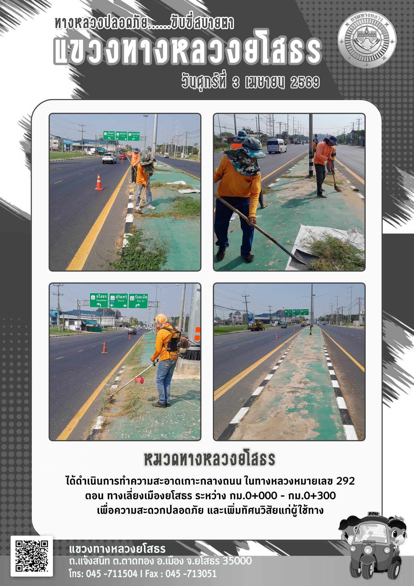 วันศุกร์ที่ 3 เมษายน 2569 หมวดทางหลวงยโสธร ได้ดำเนินการทำความสะอาดเกาะกลางถนน ในทางหลวงหมายเลข 292 ตอน ทางเลี่ยงเมืองยโสธร ระหว่าง กม.0+000 - กม.0+300 เพื่อความสะดวกปลอดภัย และเพิ่มทัศนวิสัยแก่ผู้ใช้ทาง
