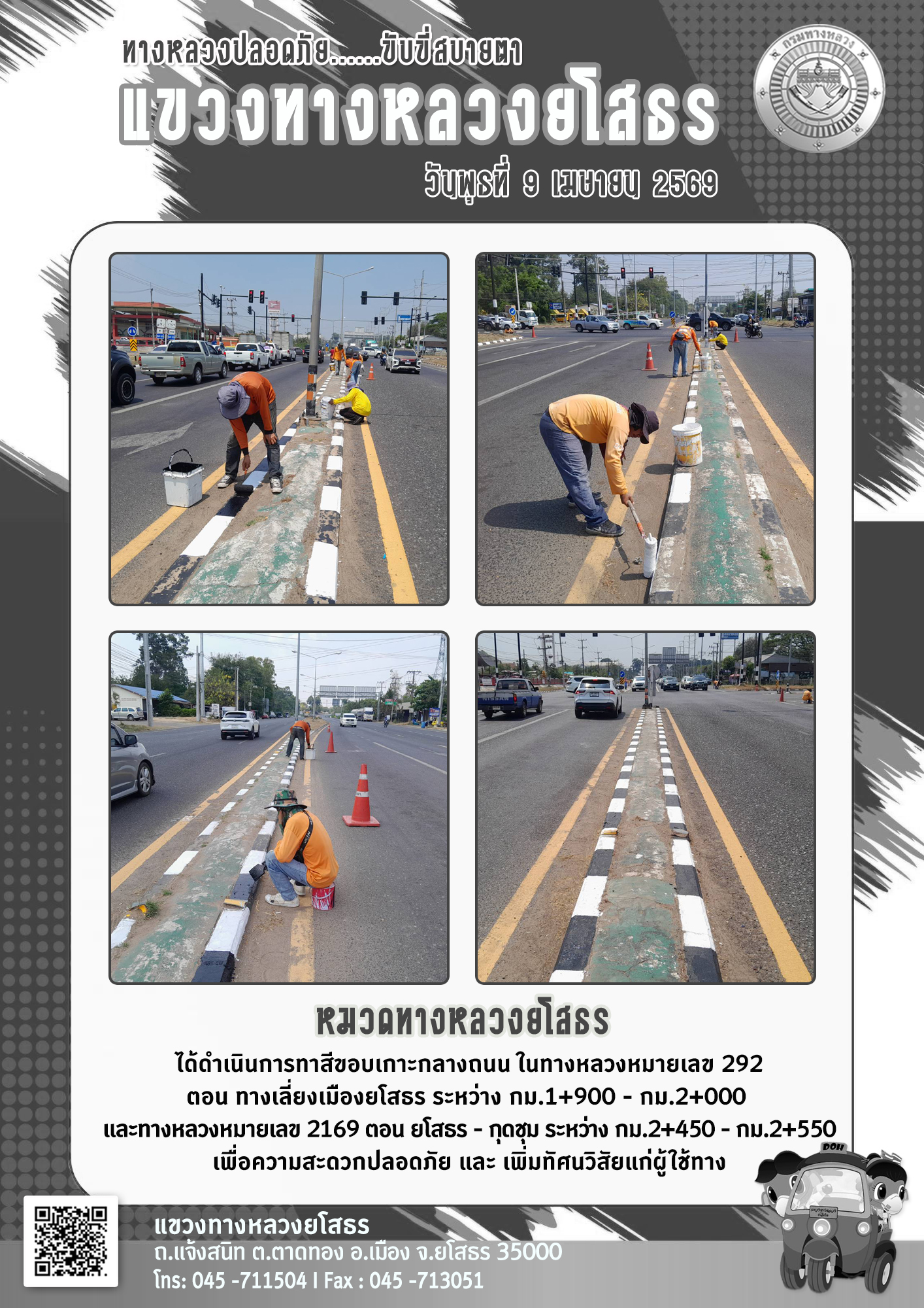 วันพุธที่ 9 เมษายน 2569 หมวดทางหลวงยโสธร ได้ดำเนินการทาสีขอบเกาะกลางถนน ในทางหลวงหมายเลข 292 ตอน ทางเลี่ยงเมืองยโสธร ระหว่าง กม.1+900 - กม.2+000 และทางหลวงหมายเลข 2169 ตอน ยโสรร - กุดชุม ระหว่าง กม.2+450 - กม.2+550 เพื่อความสะดวกปลอดภัย