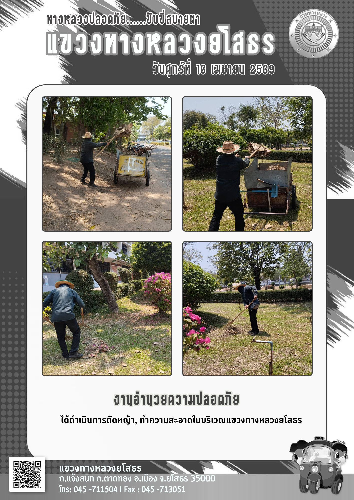 - [11:56] ทั่วไป วันศุกร์ที่ 10 เมษายน 2569 งานอำนวยความปลอดภัย ได้ดำเนินการตัดหญ้า, ทำความสะอาดในบริเวณแขวงทางหลวงยโสธร