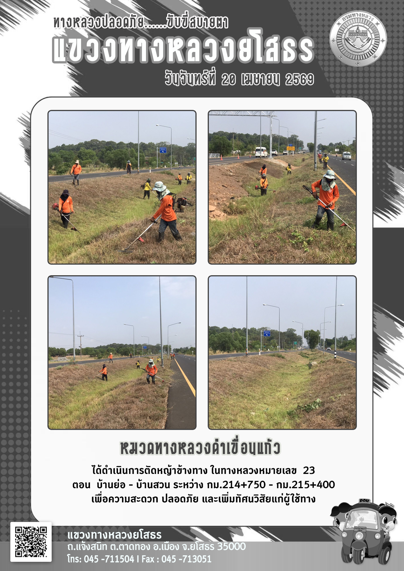 - [15:29] ทั่วไป วันจันทร์ที่ 20 เมษายน 2569 งานอำนวยความปลอดภัย ได้ดำเนินการตัดหญ้า, ทำความสะอาดในบริเวณแขวงทางหลวงยโสธร