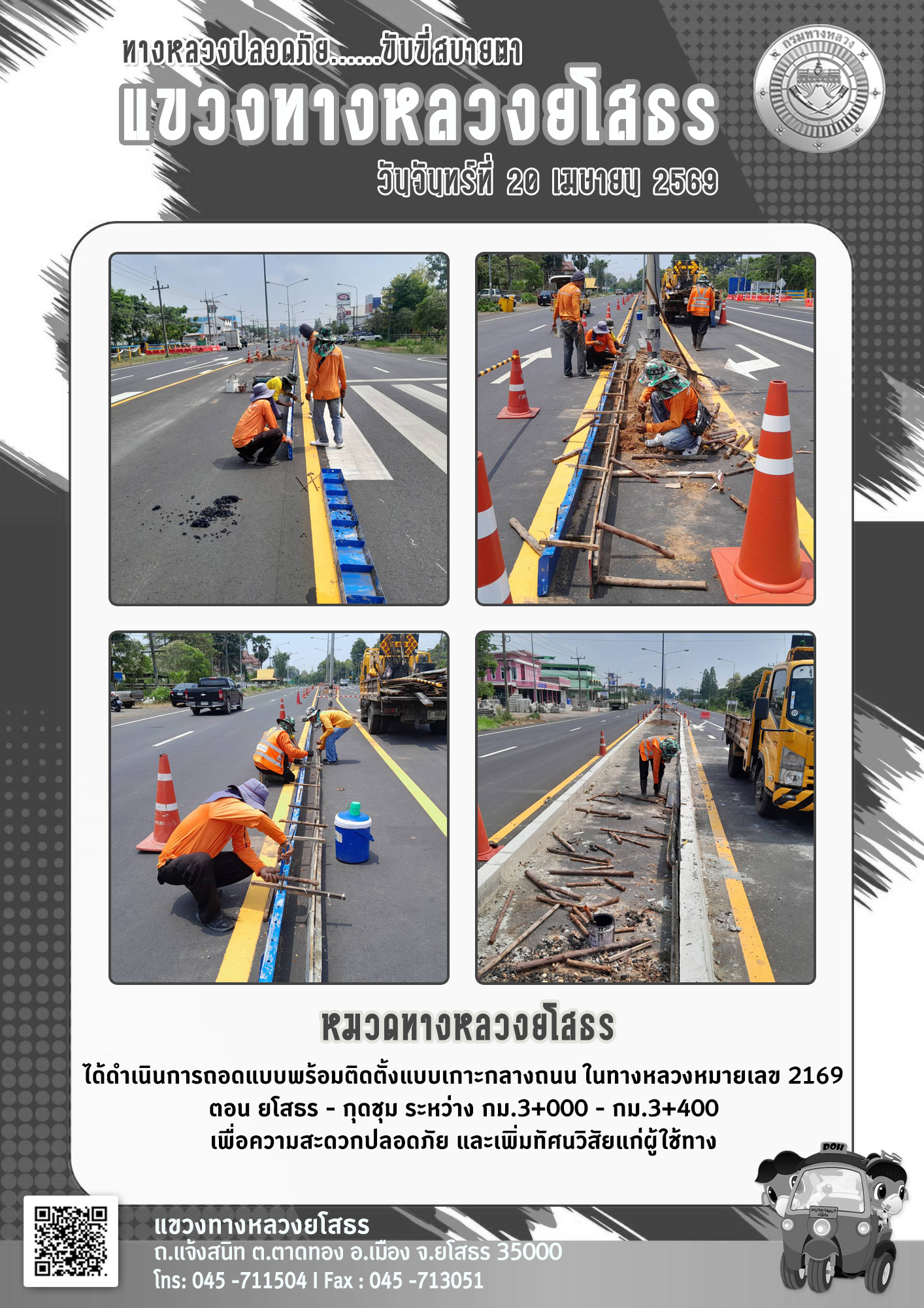 วันจันทร์ที่ 20 เมษายน 2569 หมวดทางหลวงยโสธร ได้ดำเนินการถอดแบบพร้อมติดตั้งแบบเกาะกลางถนน ในทางหลวงหมายเลข 2169 ตอน ยโสธร - กุดชุม ระหว่าง กม.3+000 - กม.3+400 เพื่อความสะดวกปลอดภัย และเพิ่มทัศนวิสัยแก่ผู้ใช้ทาง