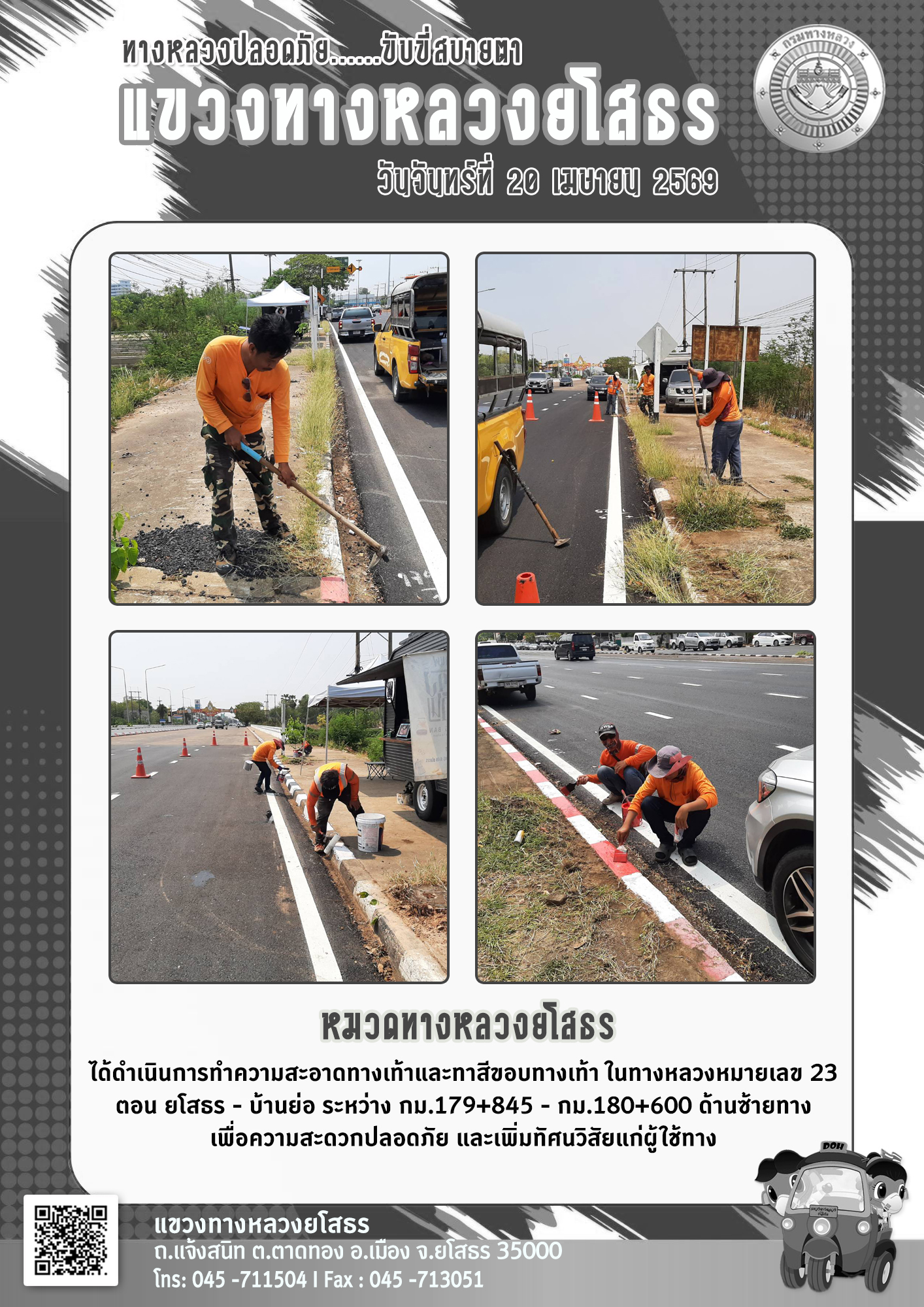วันจันทร์ที่ 20 เมษายน 2569 หมวดทางหลวงยโสธร ได้ดำเนินการทำความสะอาดทางเท้าและทาสีขอบทางเท้า ในทางหลวงหมายเลข 23 ตอน ยโสธร - บ้านย่อ ระหว่าง กม.179+845 - กม.180+600 ด้านซ้ายทาง เพื่อความสะดวกปลอดภัย และเพิ่มทัศนวิสัยแก่ผู้ใช้ทาง
