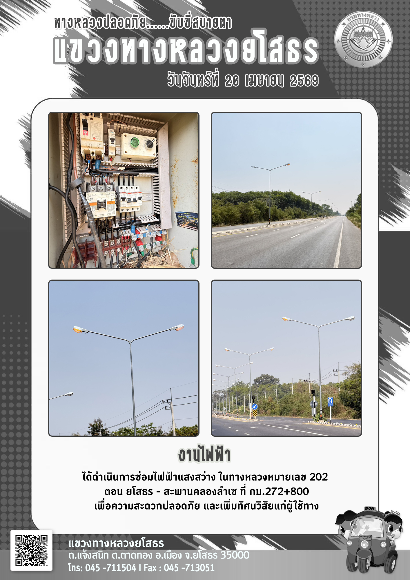 วันจันทร์ที่ 20 เมษายน 2569 งานไฟฟ้า ได้ดำเนินการซ่อมไฟฟ้าแสงสว่าง ในทางหลวงหมายเลข 202 ตอน ยโสธร - สะพานคลองลำเซ ที่ กม.272+800 เพื่อความสะดวกปลอดภัย และเพิ่มทัศนวิสัยแก่ผู้ใช้ทาง