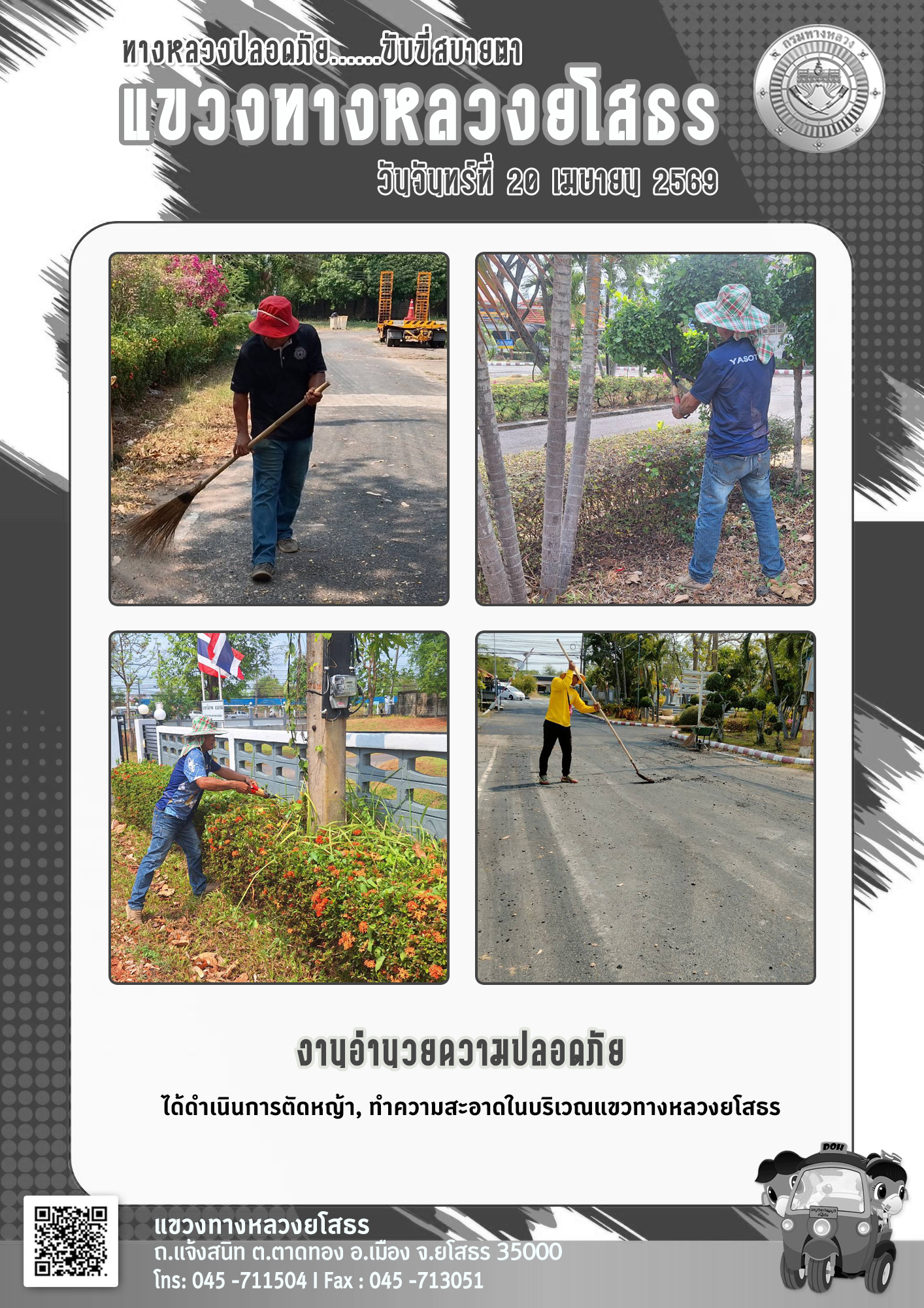- [15:29] ทั่วไป วันจันทร์ที่ 20 เมษายน 2569 งานอำนวยความปลอดภัย ได้ดำเนินการตัดหญ้า, ทำความสะอาดในบริเวณแขวงทางหลวงยโสธร
