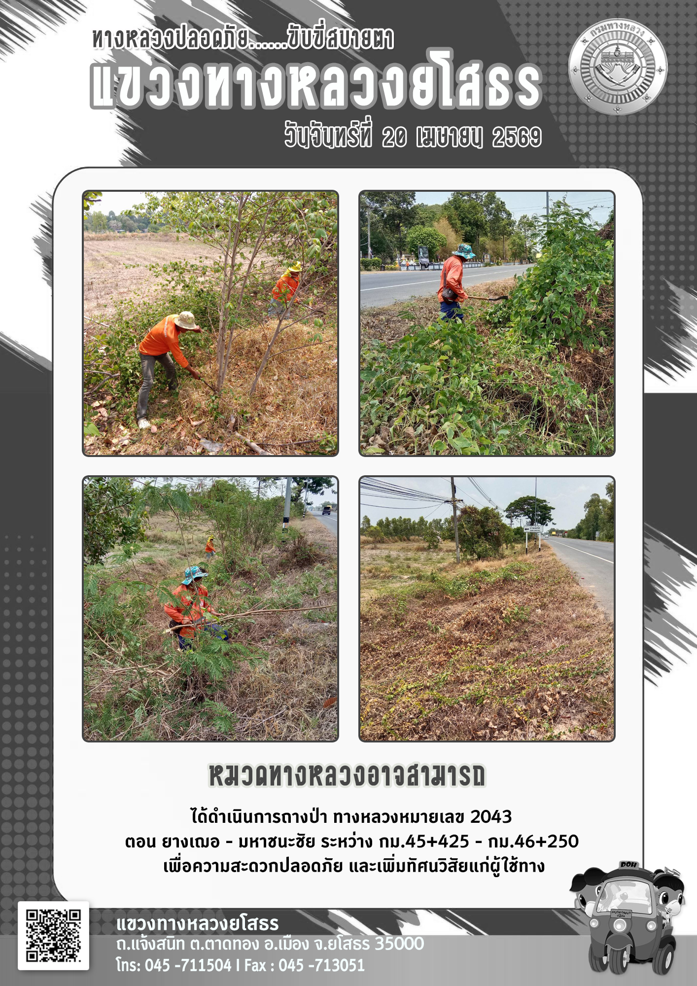 - [15:30] ทั่วไป วันจันทร์ที่ 20 เมษายน 2569 หมวดทางหลวงอาจสามารถ ได้ดำเนินการถางป่า ในทางหลวงหมายเลข 2043 ตอน ยางเฌอ - มหาชนะชัย ระหว่าง กม.45+425 - กม.46+250 เพื่อความสะดวกปลอดภัย และเพิ่มทัศนวิสัยแก่ผู้ใช้ทาง
