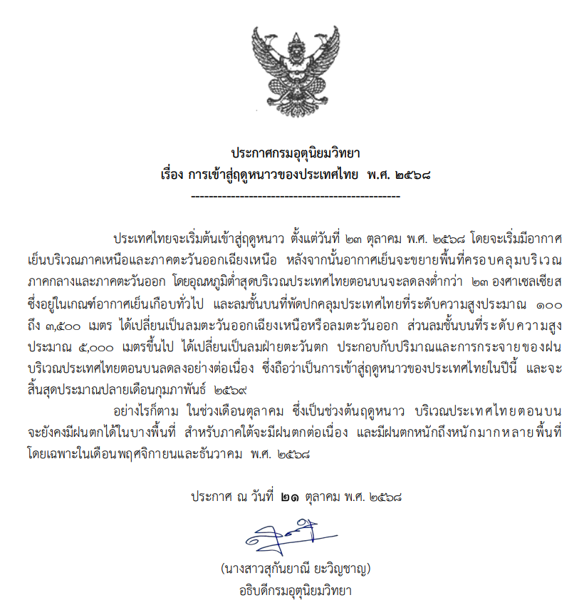 วันที่ 23 ต.ค. 2568 (22:08 น.)ประเทศไทยจะเริ่มต้นเข้าสู่ฤดูหนาว ตั้งแต่วันที่ ๒๓ ตุลาคม พ.ศ. ๒๕๖๘ โดยจะเริ่มมีอากาศเย็นบริเวณภาคเหนือและภาคตะวันออกเฉียงเหนือ หลังจากนั้นอากาศเย็นจะขยายพื้นที่ครอบคลุมบริเวณภาคกลางและภาคตะวันออก โดยอุณหภูมิต่ำสุดบริเวณประเทศไทยตอนบนจะลดลงต่ำกว่า ๒๓ องศาเซลเซียสซึ่งอยู่ในเกณฑ์อากาศเย็นเกือบทั่วไป และลมชั้นบนที่พัดปกคลุมประเทศไทยที่ระดับความสูงประมาณ ๑๐๐ถึง ๓,๕๐๐ เมตร ได้เปลี่ยนเป็นลมตะวันออกเฉียงเหนือหรือลมตะวันออก ส่วนลมชั้นบนที่ระดับควา มสูงประมาณ ๕,๐๐๐ เมตรขึ้นไป ได้เปลี่ยนเป็นลมฝ่ายตะวันตก ประกอบกับปริมาณและการกระจายของฝนบริเวณประเทศไทยตอนบนลดลงอย่างต่อเนื่อง ซึ่งถือว่าเป็นการเข้าสู่ฤดูหนาวของประเทศไทย
